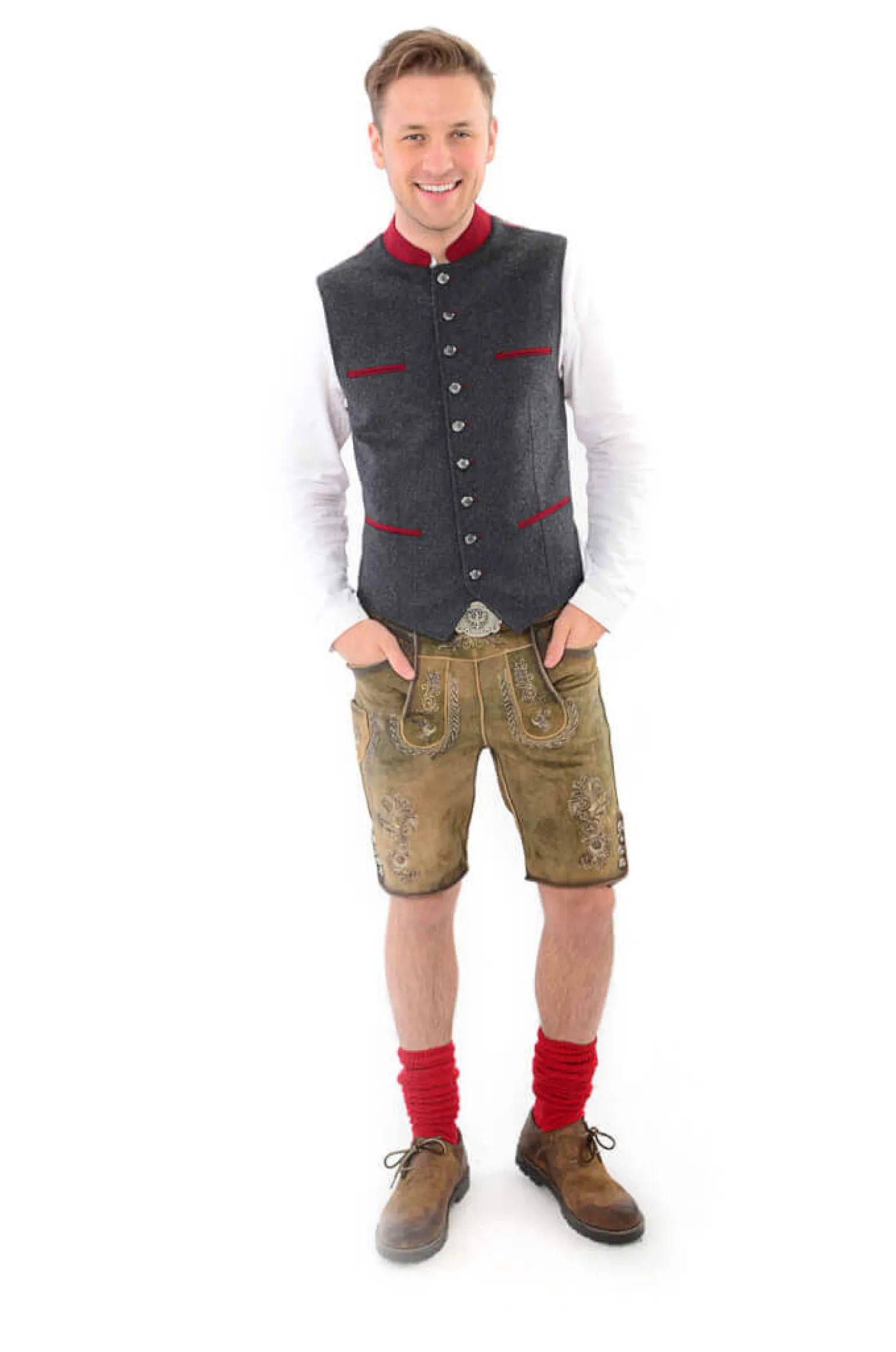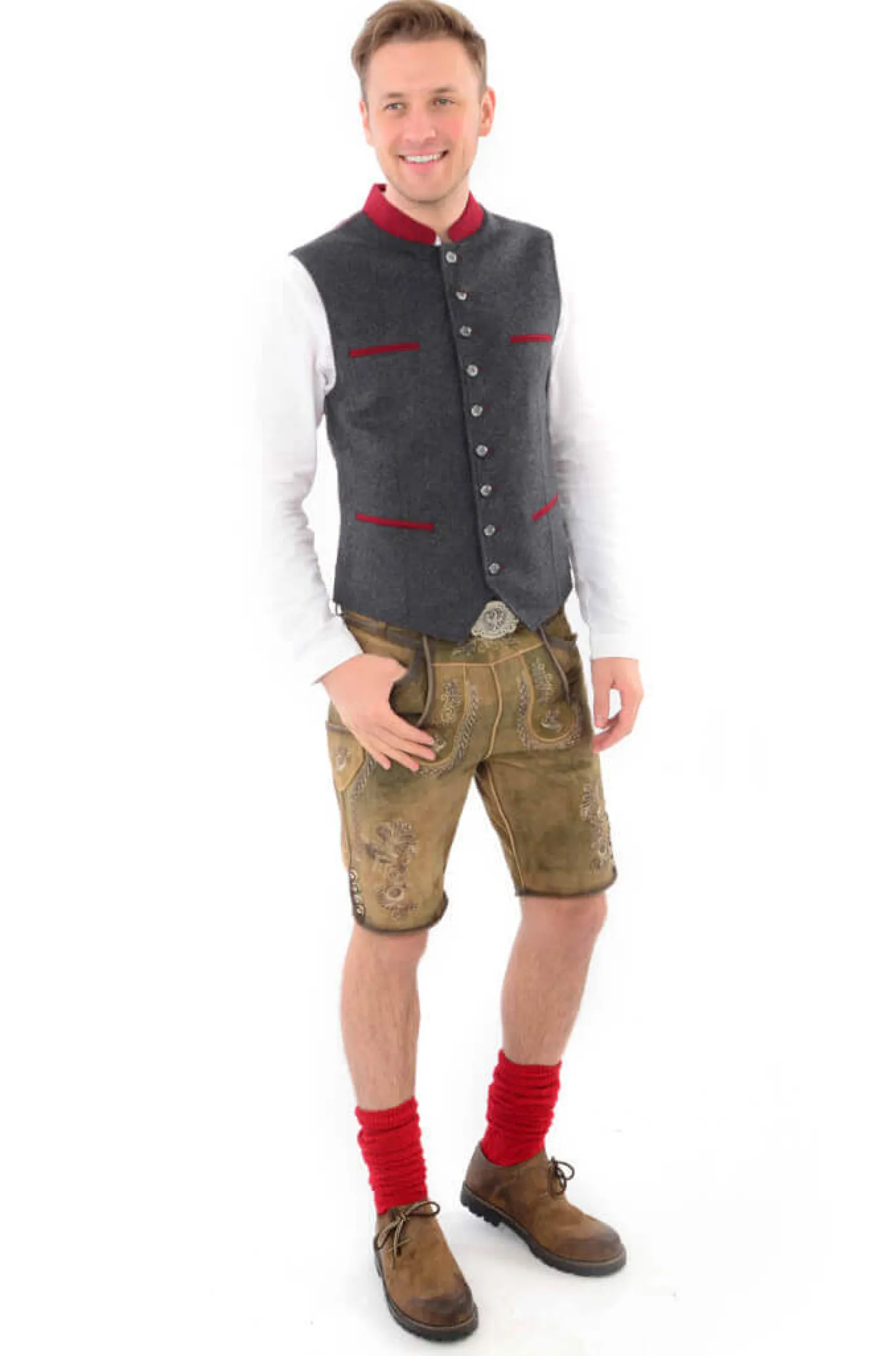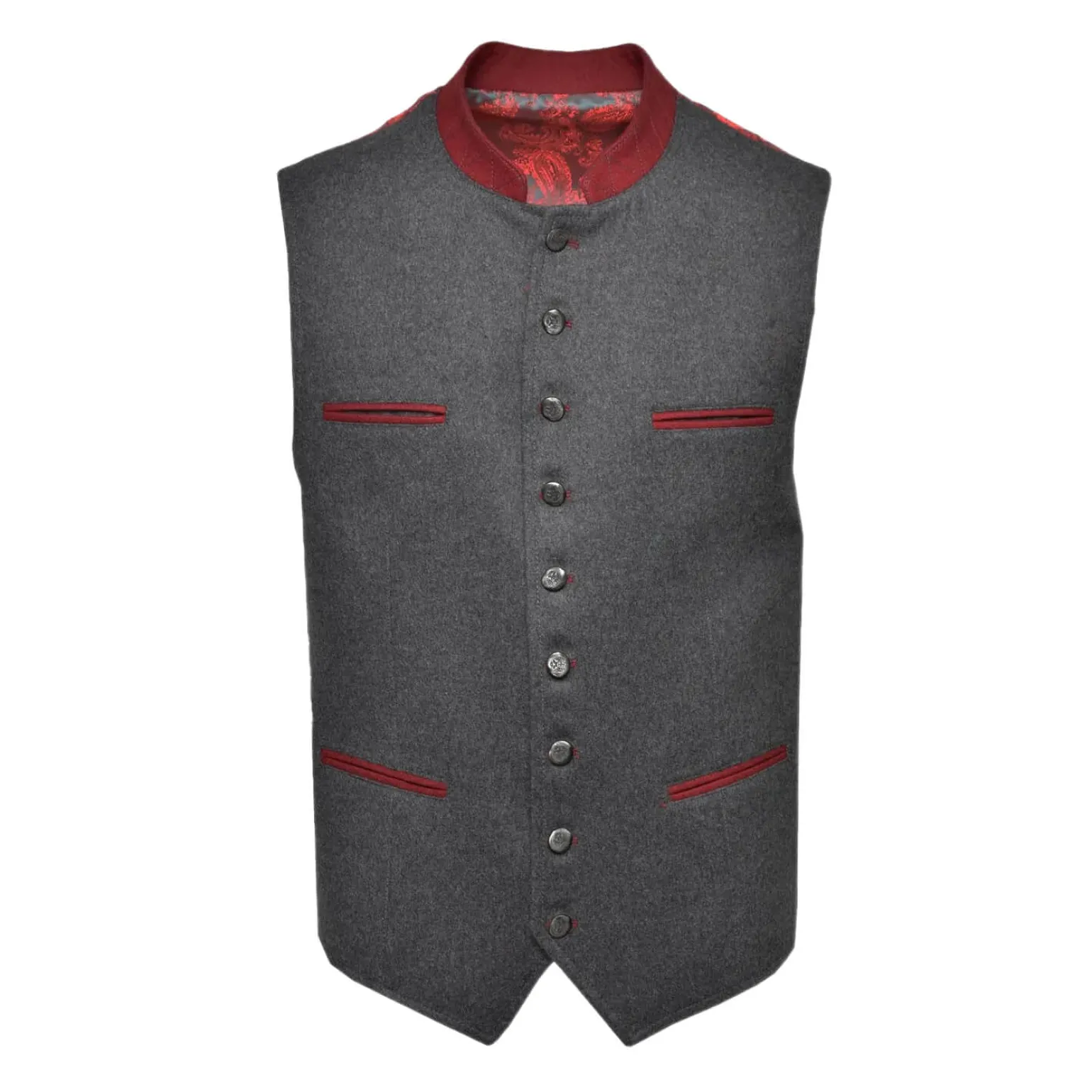 Schönes Herren-Gilet aus grauem Wollmaterial. Innen und am Rücken hat es ein Paisley-Muster in Rot. Es gibt eine Innentasche mit Reißverschluss. Vorne hat es dekorative Paspeltaschen in Rot und dekorative Knöpfe. Das Tirolgilet ist der ideale Kombipartner zur Lederhose oder auch lässig zur Jeans.