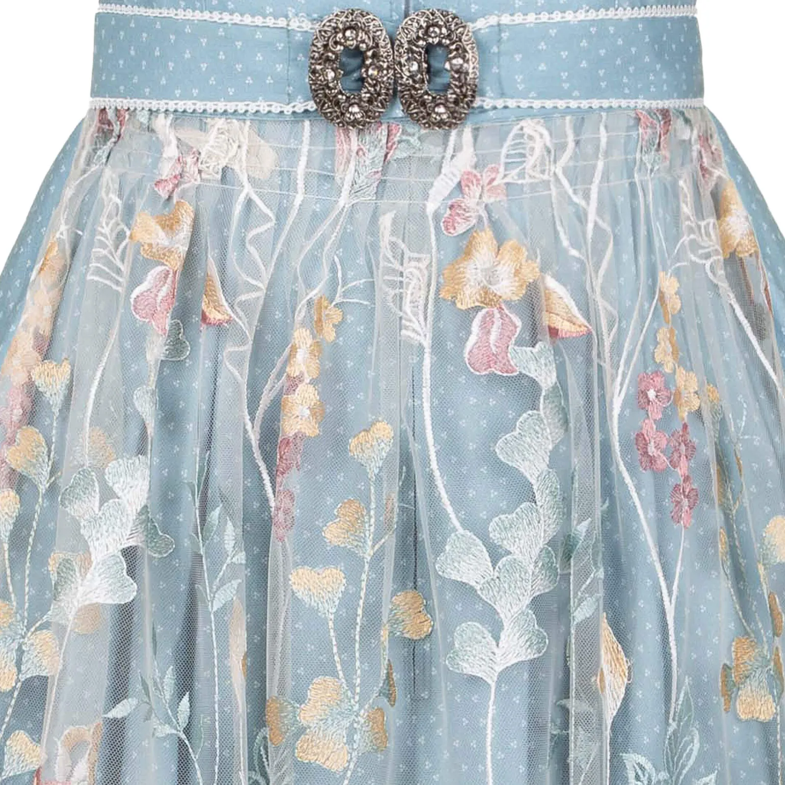 Das Dirndl ist in einem sanften Hellblau gehalten und mit einem dezenten Muster aus kleinen, weißen Blümchen versehen, das dem Kleid einen charmanten und verspielten Look verleiht. Der Reißverschluss befindet sich vorne, was dem Dirndl eine moderne Note gibt und gleichzeitig das Anziehen erleichtert.Die Schürze ist aus Spitze gefertigt und mit zarten floralen Stickereien in dezenten Farbtönen verziert. Der Verschluss der Schürze ist eine Trachtenschnalle, die mit Straßsteinen verziert ist. Rund um den Ausschnitt zieht sich eine kleine, weiße Borte, die das Dekolleté sanft betont und das Gesamtbild harmonisch abrundet.