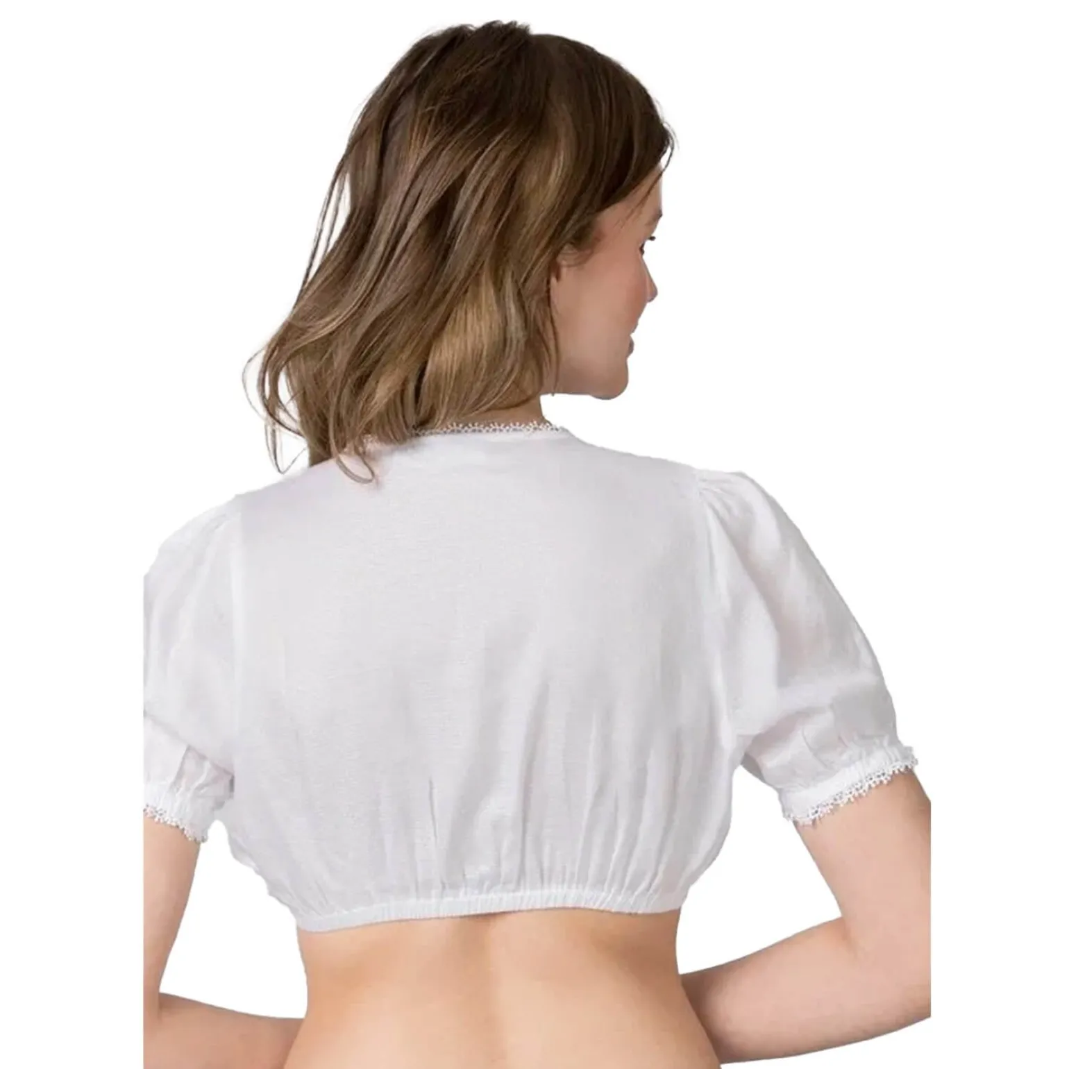 Mit ihrer exzellenten Passform und den raffinierten Details überzeugt die Dirndl-Bluse „Leana“ in Weiß. Der Ausschnitt, veredelt mit feiner Spitze, verleiht eine edle Note, während der Tunnelzug in der vorderen Mitte die Weite individuell anpasst. Charmante kurze Ärmel setzen stilvolle Akzente und verleihen der Bluse zusätzlichen Charme. Zusammen mit einem feschen Dirndl sorgt sie für traditionelle Eleganz. Neben ihrem attraktiven Design bietet „Leana“ auch hohen Tragekomfort, der für ein rundum angenehmes Gefühl in Ihrer Tracht sorgt.