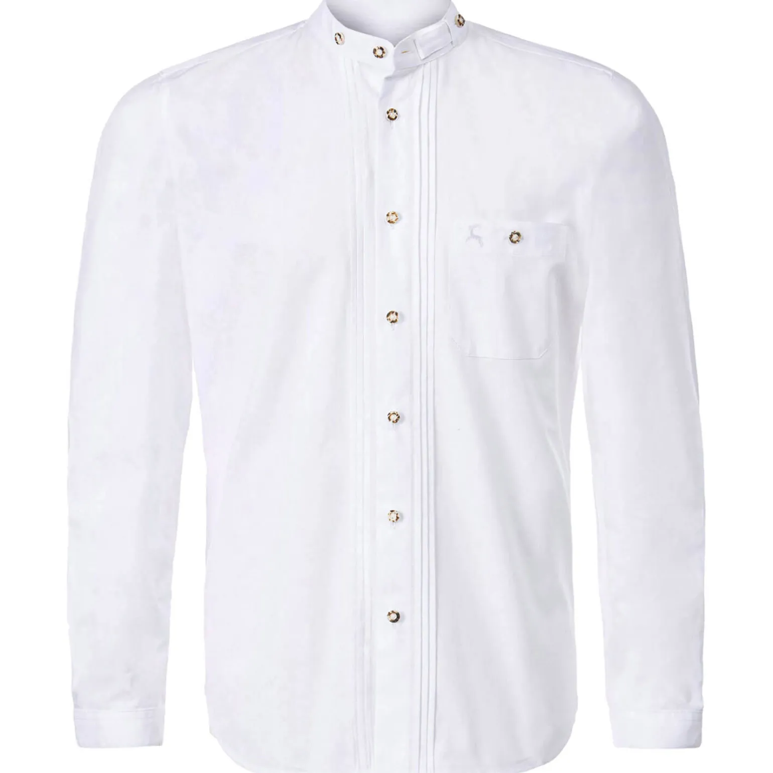 Das leger geschnittene Modell aus angenehmer Baumwolle überzeugt durch traditionelle Details.Elemente wie ein schmaler Steh-Kragen, sowie der abgerundete Saum setzen klassische Akzente, während Hornknöpfe als auch die Brusttasche eine besondere Note verleihen.Der Biesen-Einsatz auf der Vorderseite unterstreicht das maskuline, trachtige Design. Die Brusttasche rundet das Gesamtbild gekonnt ab.