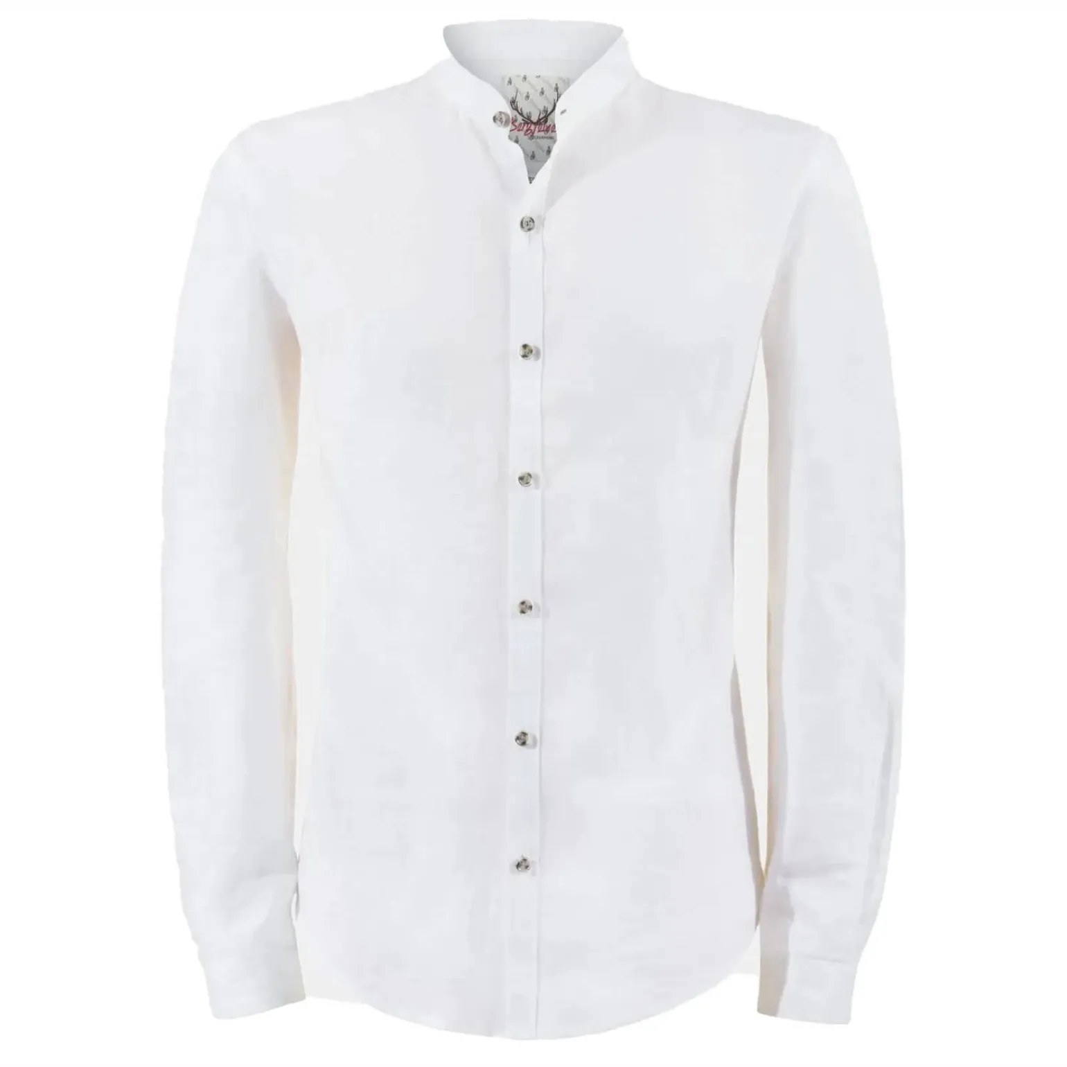 Langärmliges Herren Hemd in Weiß, aus Leinen. Es hat schicke Knöpfe und einen niedrigen Stehkragen. Passt perfekt zur Lederhose oder einfach leger zur Jeans.