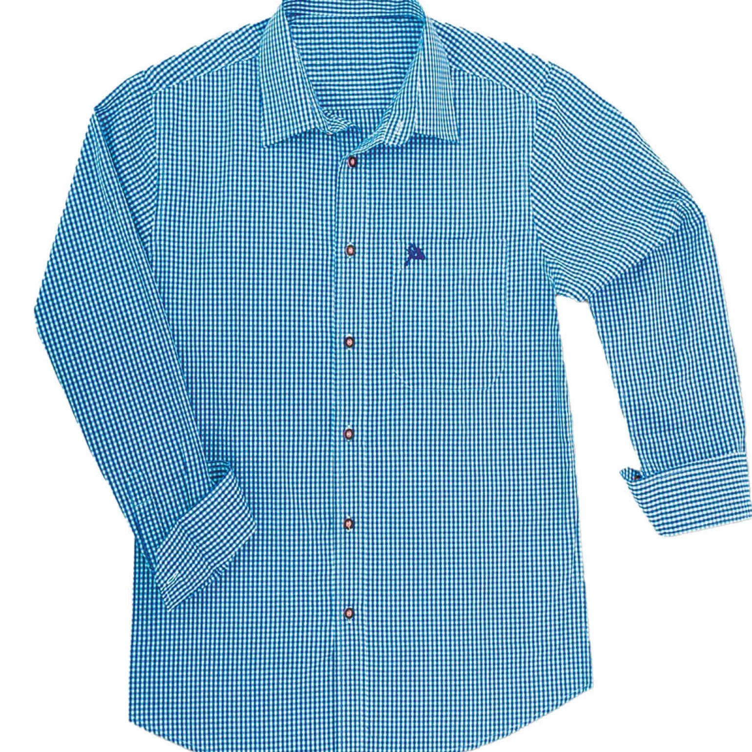 Unser langärmliges Kinder Trachtenhemd in Blau kariert kombiniert Tradition und Komfort auf ideale Weise. Das markante Karomuster und die stilvollen Hirschhornknöpfe verleihen dem Hemd einen authentischen Trachten-Look, der sich für jeden Anlass eignet. Ob mit Lederhosen oder Jeans getragen – das Hemd bringt eine frische, bayrische Note in jedes Outfit. Perfekt für kleine Abenteurer, die auch an kühleren Tagen bequem und modisch unterwegs sein möchten!