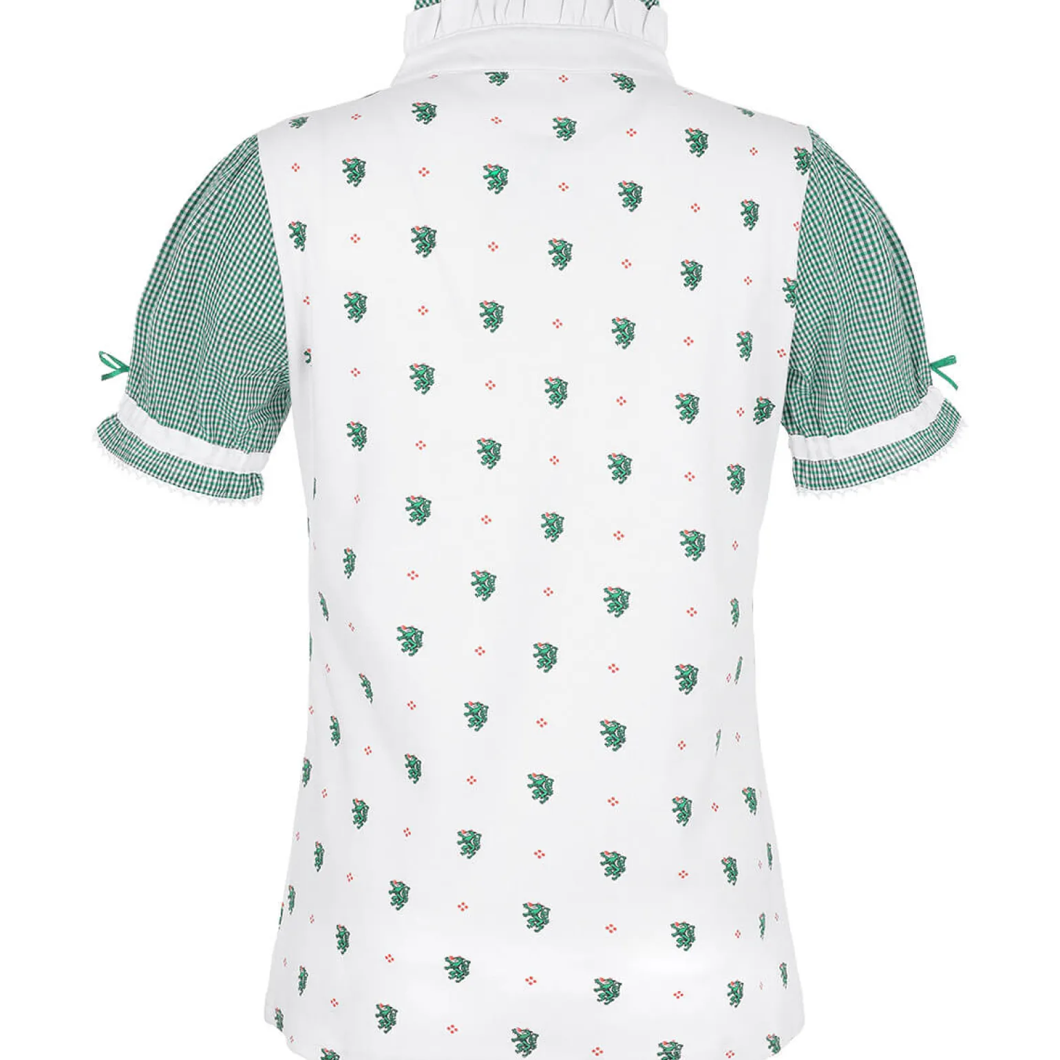 Das Damen Rüschen-Shirt „Steiermark“ ist stilvoll und bequem. Es ist weiß mit grünen Akzenten und aus Baumwolle. Der V-Ausschnitt hat hübsche Rüschen, die es besonders machen. Die Puffärmelchen sind mit einem grünen Karomuster und jeweils einer Maschen verziert, die dem Shirt einen charmanten Stil verleihen. Auf der Brust gibt es eine karierte Masche. Kleine Steiermark-Wappen-Drachen sind auf dem ganzen Shirt verteilt, was es einzigartig macht. Das Shirt ist perfekt für festliche Anlässe, Trachtenevents oder einfach für jeden Tag. Es zeigt deine Liebe zur Steiermark und ist ein Muss für alle, die Tradition und Stil mögen.