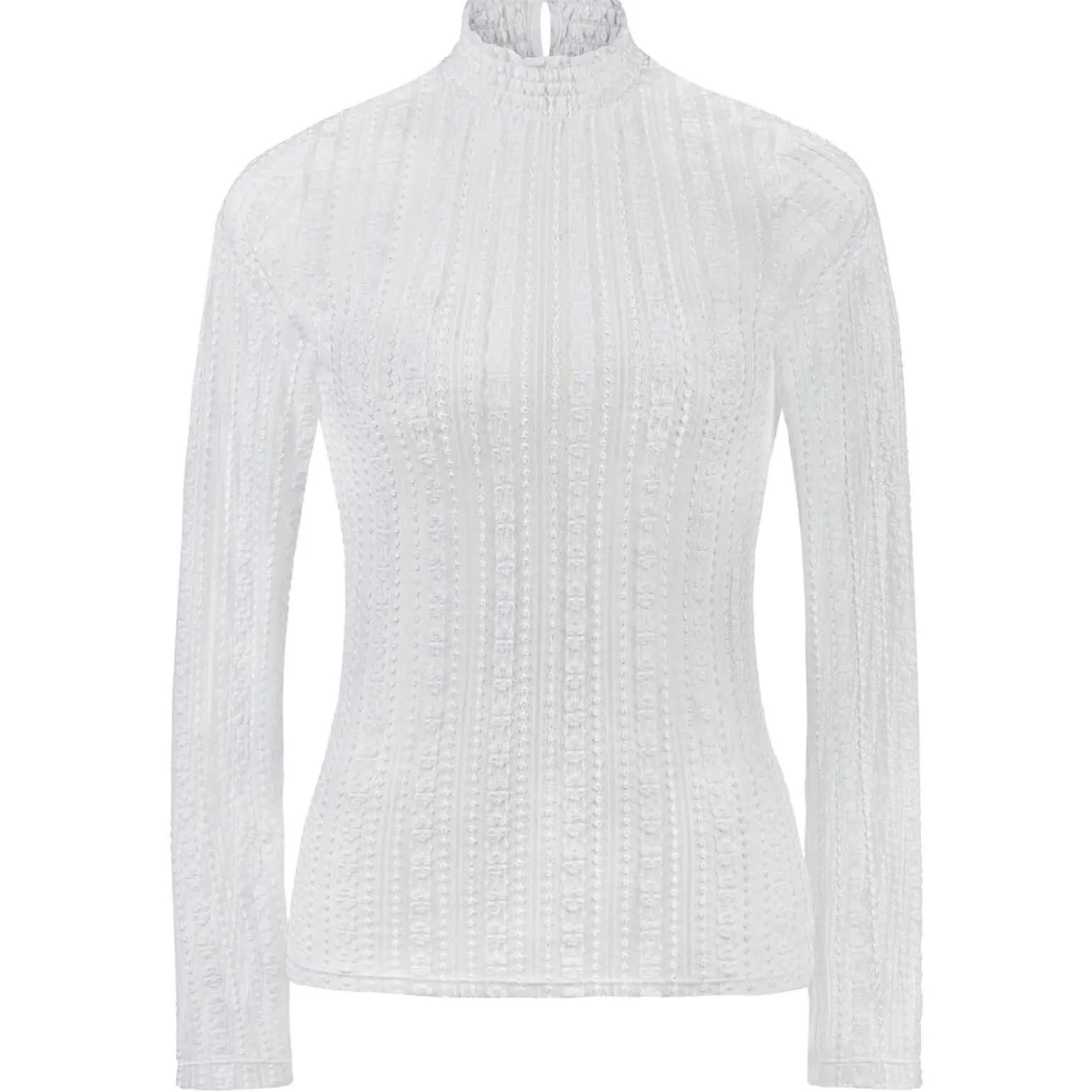 Dieses T-Shirt in zartem Creme besteht aus einem durchsichtigen Spitzenstoff, der ihm eine leichte und elegante Ausstrahlung verleiht – ideal für einen schicken Trachtenlook. Der hochgeschlossene Langarm-Schnitt sorgt für eine stilvolle Abdeckung und unterstreicht gleichzeitig die feminine Seite.Der Stehkragen ist mit hübschen Perlknöpfen verziert, was dem Shirt eine besondere und traditionelle Note gibt.