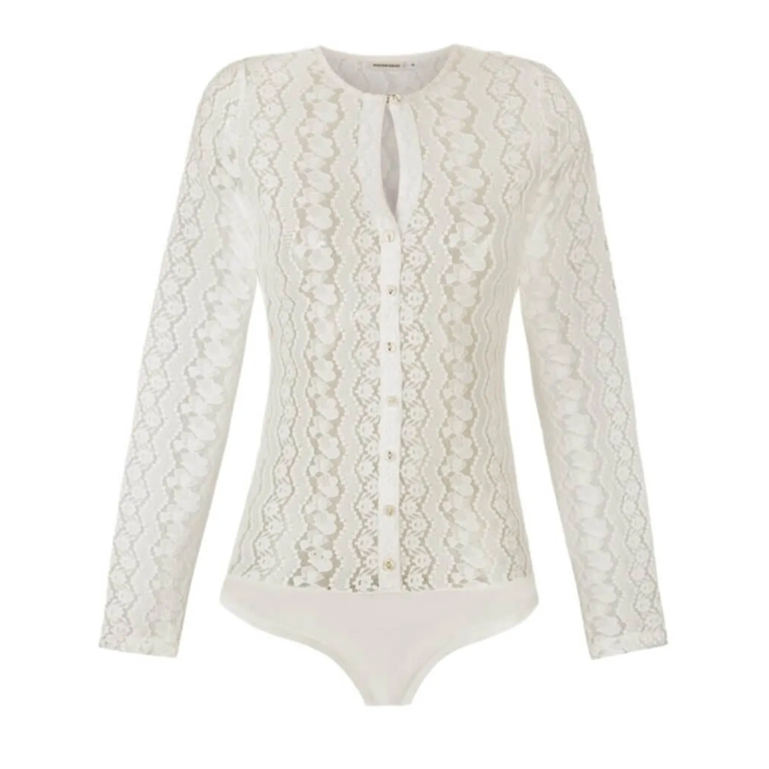 Der cremefarbene Damenbody „Dani“ im eleganten Streifenlook überzeugt mit hochwertigem Spitzenstoff und raffinierten Details. Der V-Ausschnitt schmeichelt dem Dekolleté, während Perlmuttknöpfe mit Strass-Steinen luxuriöse Akzente setzen. Lange Ärmel runden das stilvolle Design ab, ideal für festliche Anlässe oder als elegantes Highlight im Alltag.