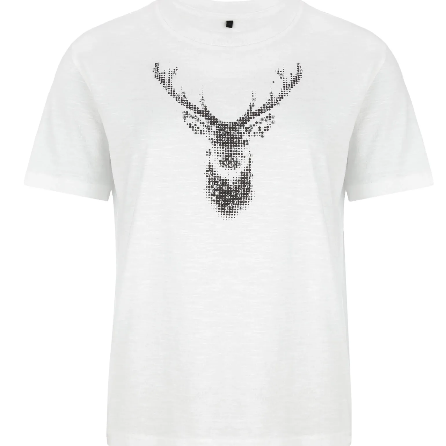 Das T-Shirt von Montefuego ist ein trendiges Kleidungsstück mit einem auffälligen Hirschkopf-Motiv in Schwarz auf der Vorderseite. Der Oversize-Schnitt und der Fledermausärmel sorgen für eine lockere, bequeme Passform, die entspannt und stilvoll wirkt.Besondere Details, wie funkelnde Edelsteine an den Beinen und am Kopf des Hirsches, verleihen dem T-Shirt eine elegante und luxuriöse Note.