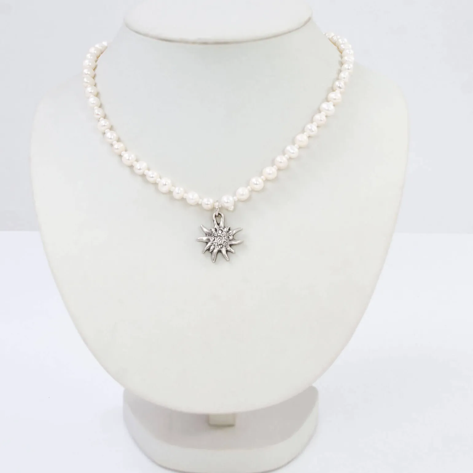 Eine Perlenkette und ein bezaubernder Edelweiß-Anhänger – unverzichtbar für Dirndl-Liebhaberinnen! Diese Kombination aus traditionellem Charme und zeitloser Eleganz veredelt jedes Outfit.Die Perlen strahlen in harmonischem Glanz neben dem edlen Edelweiß-Anhänger, der mit funkelnden Straßsteinen verziert ist. Die Trachtenkette „Edelweiss“ komplettiert nicht nur Ihr Dirndl, sondern verleiht jedem Anlass eine stilvolle Note.