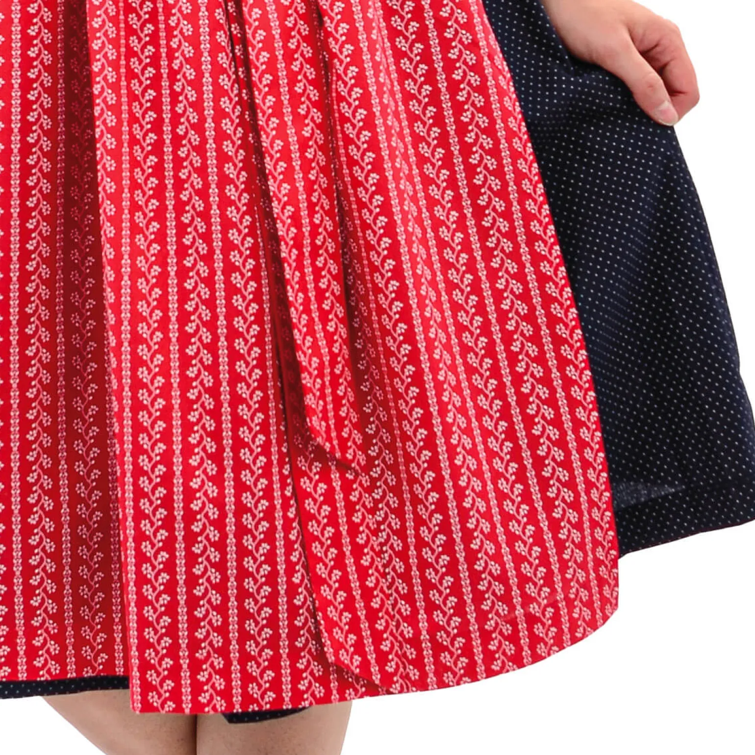 Die hellrote Schürze bildet einen wunderschönen Kontrast zum gepunkteten Dirndl. Sie verleiht dem Outfit eine fröhliche und lebhafte Ausstrahlung. Die Schürze kann leicht gebunden werden und betont die Taille auf elegante Weise.