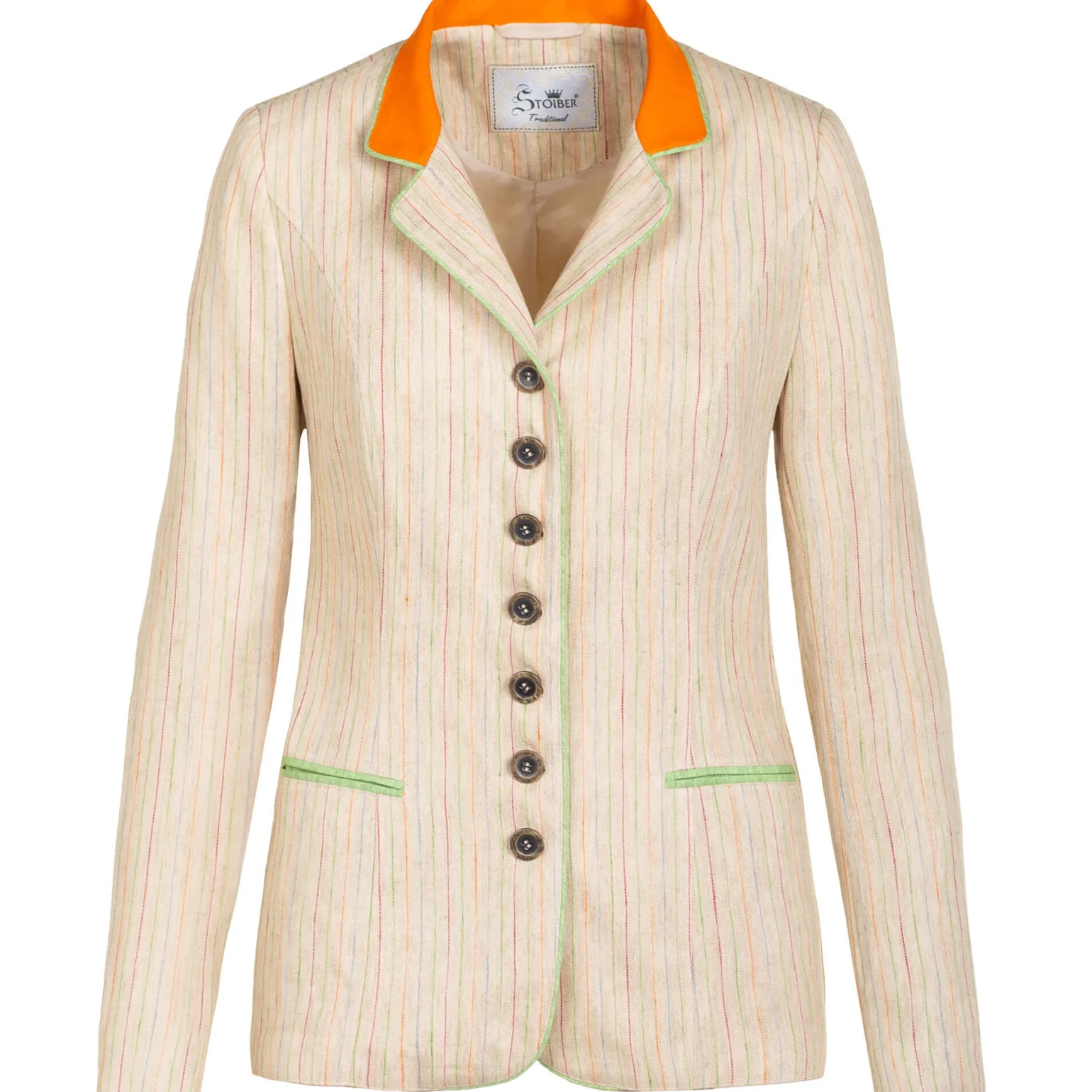 Leichter Leinenblazer in elegantem Sandton, akzentuiert durch feine, farblich passende Streifen. Der orangefarbene Innenkragen und die grüne Paspellierung verleihen dem Blazer einen frischen, stilvollen Touch.Ausgestattet mit zwei praktischen Einschubtaschen und teils gefüttert, bietet er sowohl Komfort als auch modische Raffinesse.