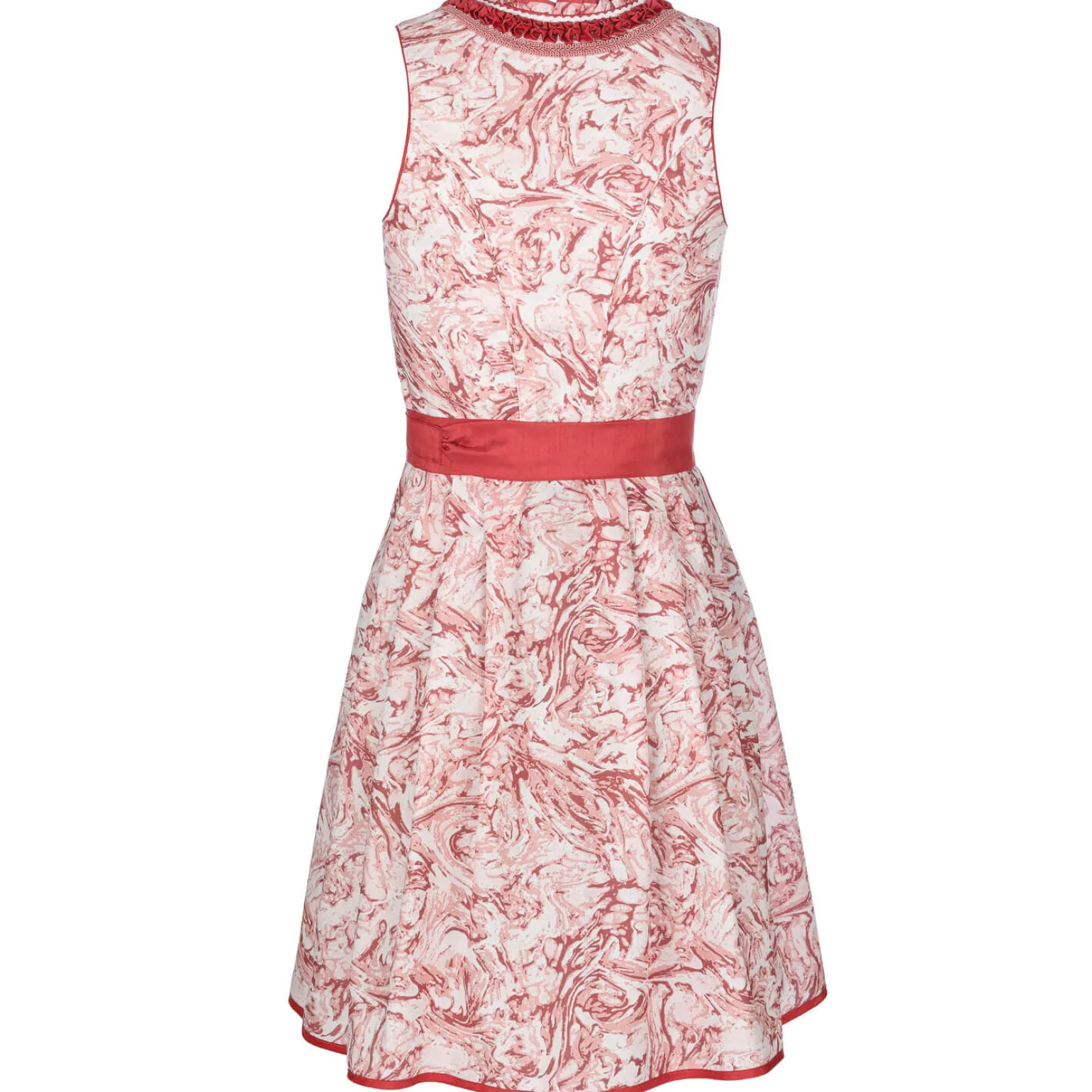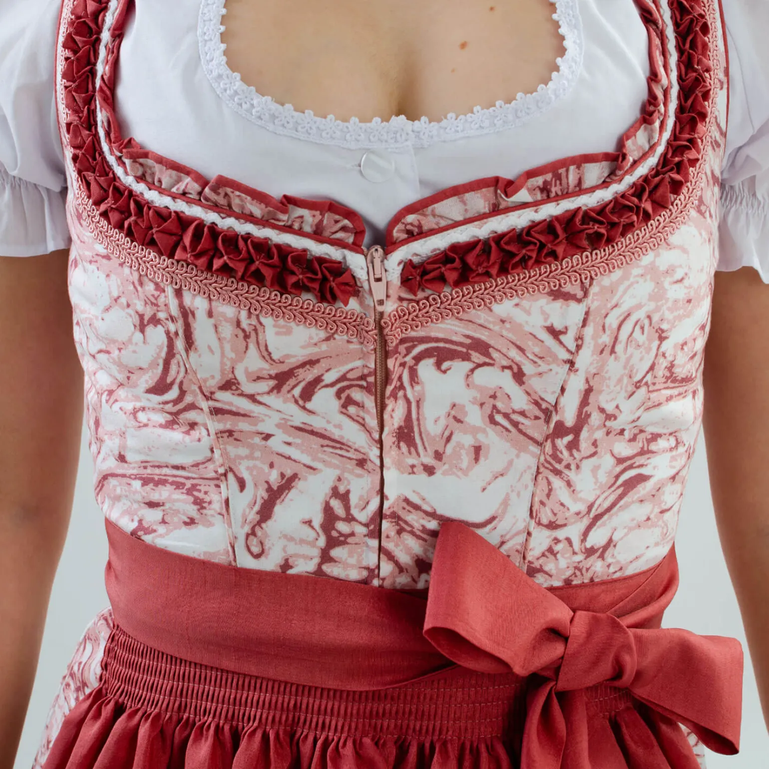 Eleganz und Komfort vereint – das Damen Dirndl „Sarah“ in Hellrot und Weiß beeindruckt mit einem ca. 70 cm langen Rock und Rüschen am Ausschnitt. Der veredelte Schurz mit modischen, aufgenähten Streifen und der praktische Reißverschluss machen es zur idealen Wahl für besondere Anlässe.