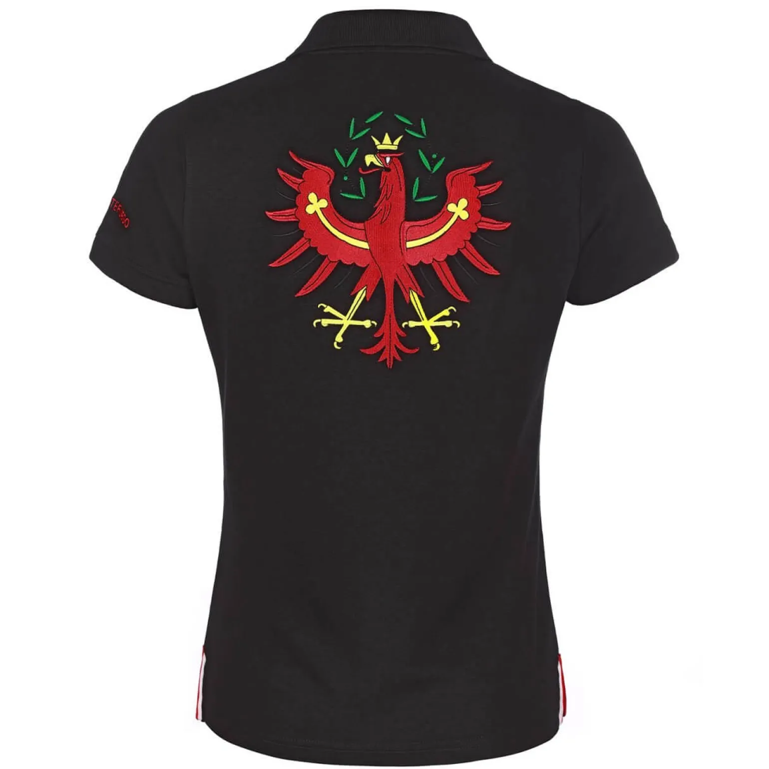 Sportlicher Charme trifft lässigen Stil im Damen Polo „Tirol“ in Schwarz. Aus Baumwolle gefertigt, bietet es exzellenten Tragekomfort. Mit Kurzarm, eleganter Knopfleiste und auffälliger Tirol-Adler-Stickerei auf dem Rücken ist es ideal für Freizeit und Alltagslook.