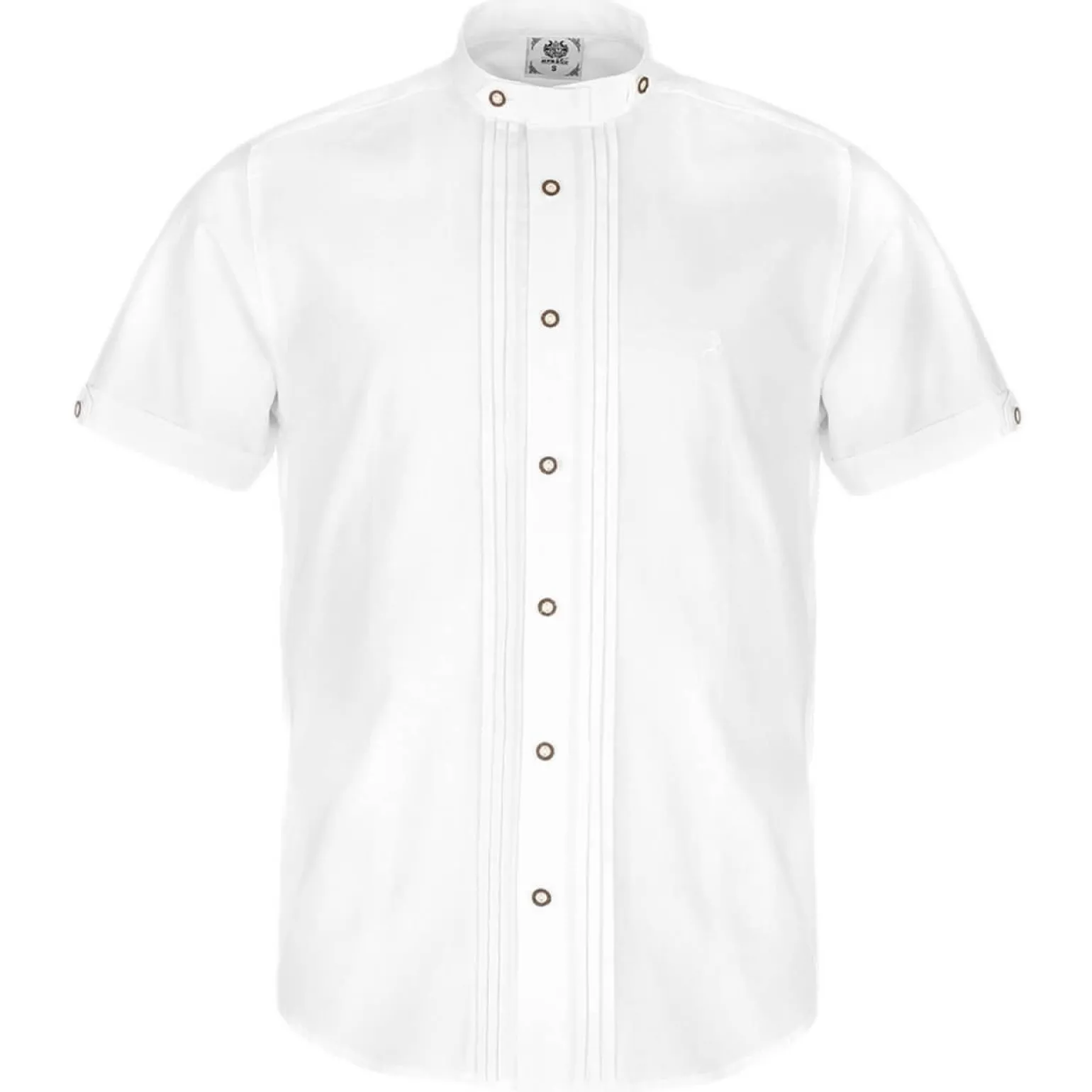 Hergestellt aus weißer Baumwolle, bietet dieses Herrenhemd kurze Ärmel und einen Stehkragen. Feine Falten zieren die Knopfleiste, und die Knöpfe sind in Hirschhornoptik gehalten. Ein Hemd, das mit seinen feinen Details und hochwertigen Materialien beeindruckt.