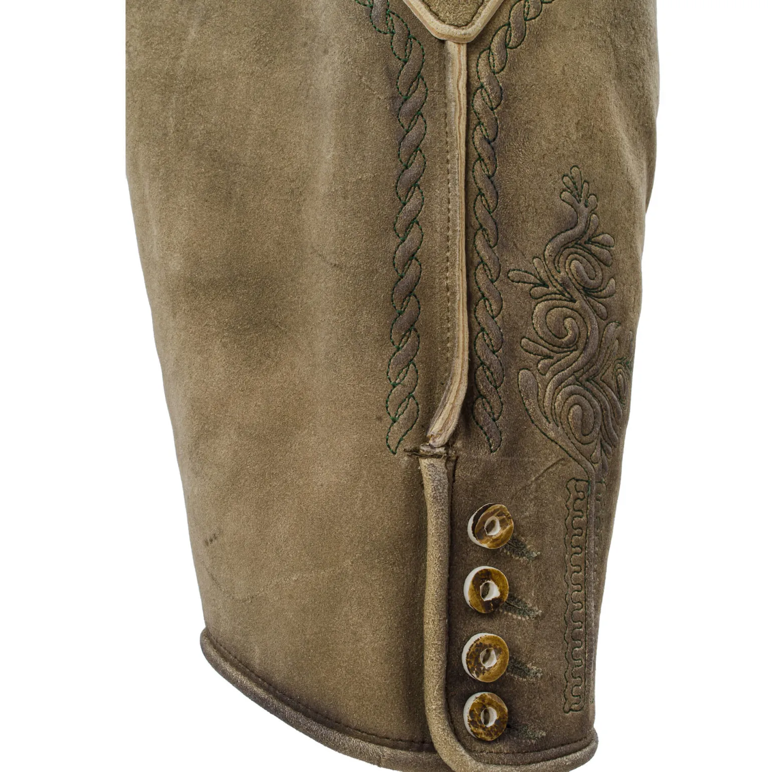 Die Hirschlederhose „Hirschvogel“ ist aus 100% Hirschleder. Hirschleder ist ein sehr hochwertiges Material, das aus der Haut von Hirschen gewonnen wird. Es ist bekannt für seine Langlebigkeit und Robustheit.