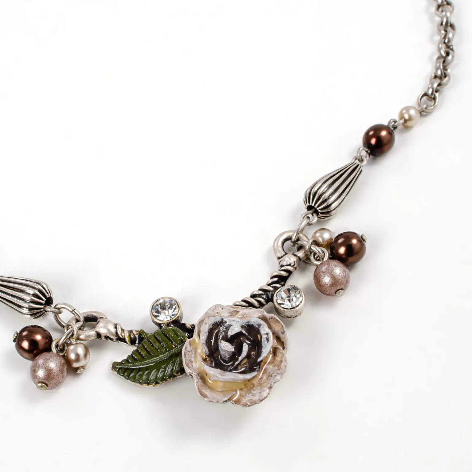 Nostalgische Trachtenkette im Vintage-Stil mit einem blumigen Anhänger in kaffeebraunen Farbzusammenstellungen. Ein klassisches Accessoire, das jedes Dirndl ergänzt.