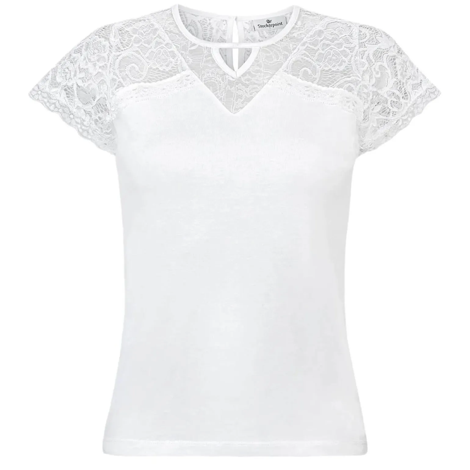Das Damen Trachten Shirt „Fernanda“ in Weiß kombiniert Raffinesse mit Komfort. Aus einer feinen Mischung aus Baumwolle, Polyamid und Elasthan gefertigt, begeistert es mit eleganten Spitzen-Details an Ärmeln und Ausschnitt. Pflegeleicht bei 30 Grad waschbar, ist es ein stilvoller und praktischer Begleiter für jeden Anlass.