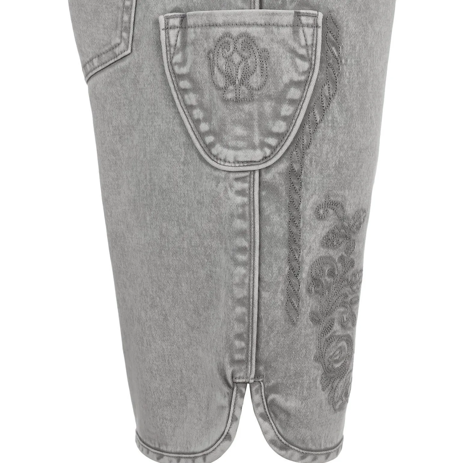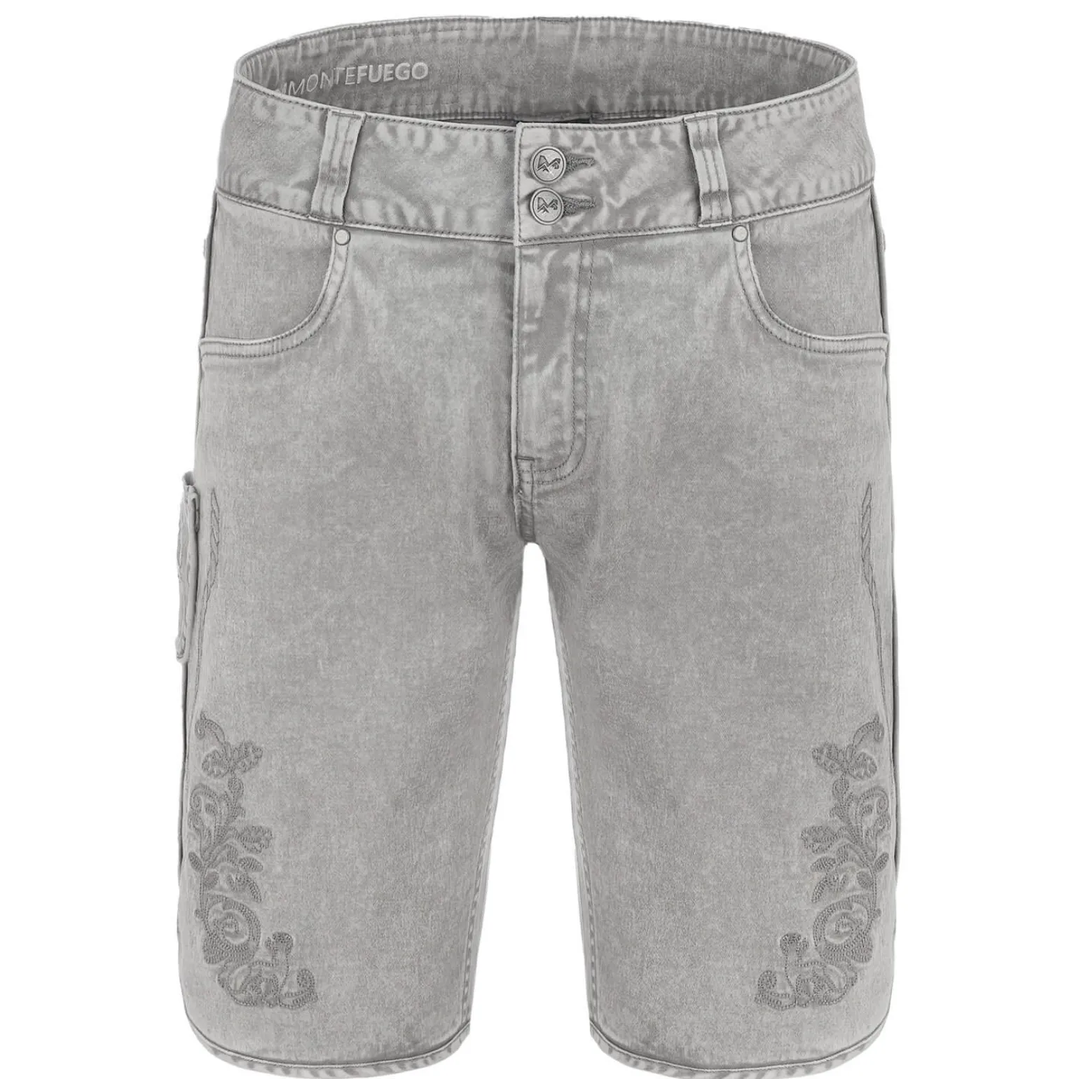 Die kurze Herren Jeans in Trachtenoptik ist in einem schönen Grauton gehalten. Der Stoff besteht aus robustem Denim aus Baumwolle und hat einen leichten Used-Look. Die Hose ist im Stil der Trachtenmode designt und hat eine schöne Stickerei vorne an beiden Beinen, auf der ein kleiner Hirsch zu sehen ist, was ihr besonderen Charme verleiht.