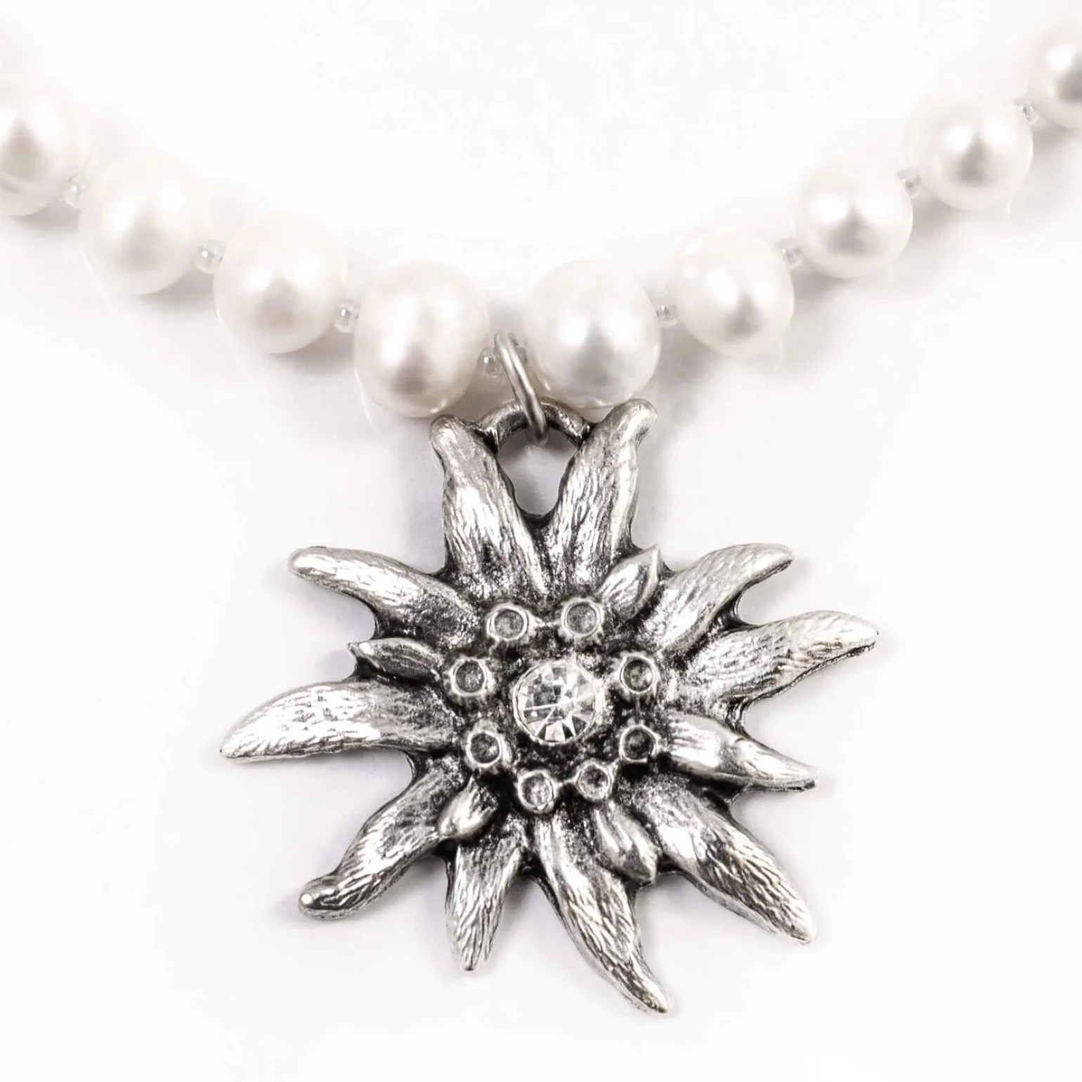 Diese Perlenkette mit Edelweiß-Anhänger verbindet traditionellen Charme mit eleganter Schönheit und macht Ihr Outfit perfekt.Die glänzenden Perlen passen wunderbar zum Edelweiß-Anhänger, der mit funkelnden Strasssteinen verziert ist.