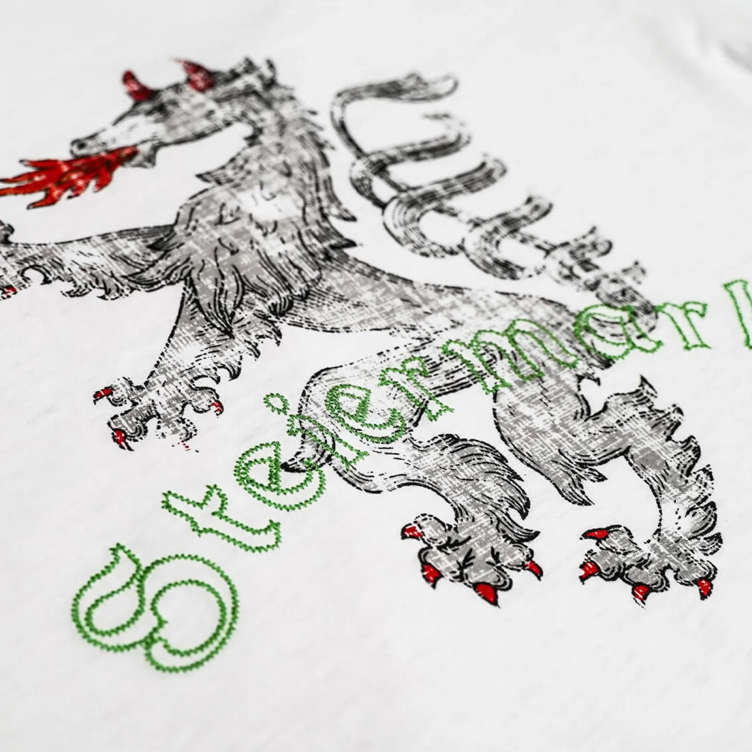 Weißes Herren T-Shirt „Steiermark“ aus Baumwolle. Kurzarm, angenehm zu tragen und verziert mit dem Steiermark Panther und dem gesticktem „Steiermark“ Schriftzug. Logo-Details an Ärmelenden und seitlich unten.