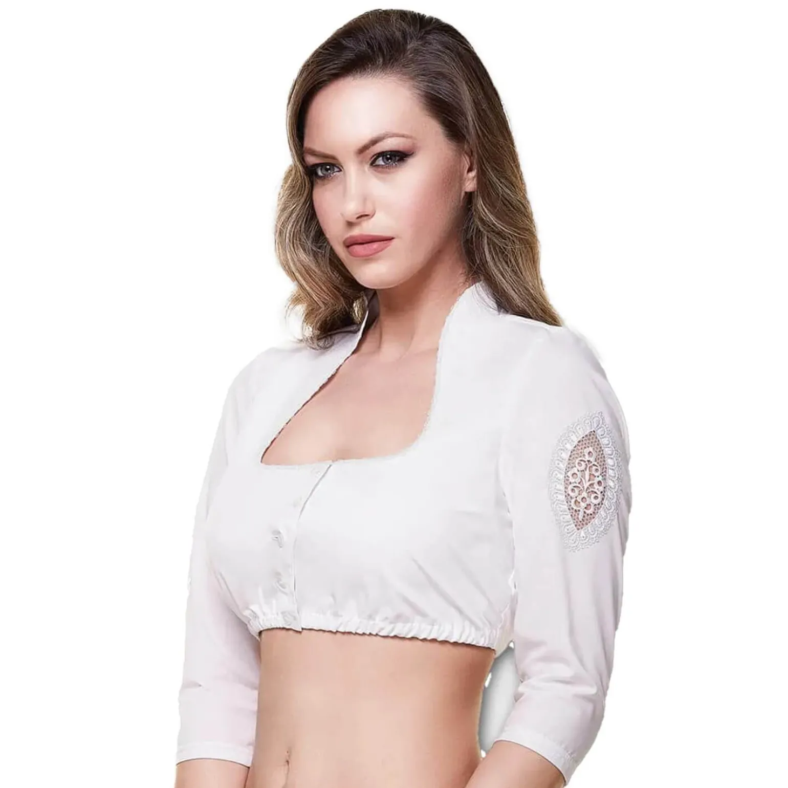 Die Dirndlbluse „Maria“ überzeugt mit ihrer eleganten und zeitlosen Ausstrahlung. Sie hat 3/4-Ärmel und einen schicken Schalkragen, der Ihrem Dirndl-Outfit eine besondere Note verleiht. Die weiße Farbe mit Spitzeneinsätzen an den Ärmeln sorgt für einen klassischen und romantischen Look.