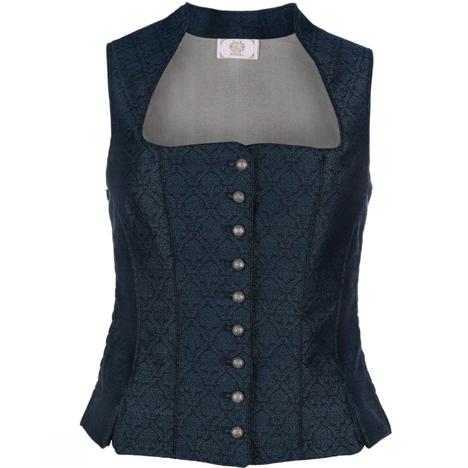 Mit dem Damen Mieder „Arina“ in Dunkelblau erleben Sie eine perfekte Verbindung von Flexibilität und Eleganz. Das dehnbare Material bietet Bewegungsfreiheit und eine ideale Passform. Die 9 Metall-Trachtenknöpfe und die elegante Musterung verleihen dem Design einen stilvollen Touch und kombinieren traditionelles Design mit modernem Komfort.