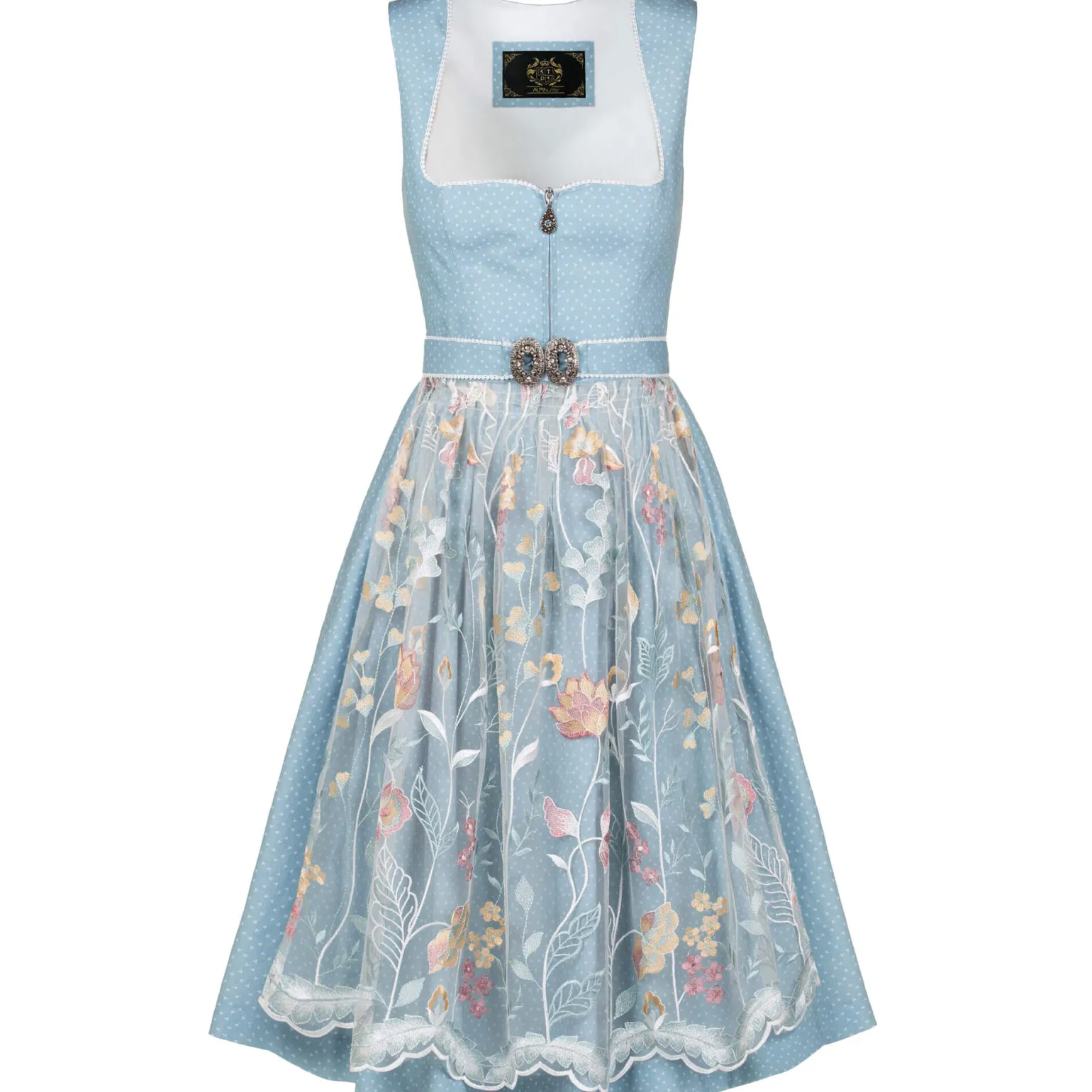 Das Dirndl ist in einem sanften Hellblau gehalten und mit einem dezenten Muster aus kleinen, weißen Blümchen versehen, das dem Kleid einen charmanten und verspielten Look verleiht. Der Reißverschluss befindet sich vorne, was dem Dirndl eine moderne Note gibt und gleichzeitig das Anziehen erleichtert.Die Schürze ist aus Spitze gefertigt und mit zarten floralen Stickereien in dezenten Farbtönen verziert. Der Verschluss der Schürze ist eine Trachtenschnalle, die mit Straßsteinen verziert ist. Rund um den Ausschnitt zieht sich eine kleine, weiße Borte, die das Dekolleté sanft betont und das Gesamtbild harmonisch abrundet.