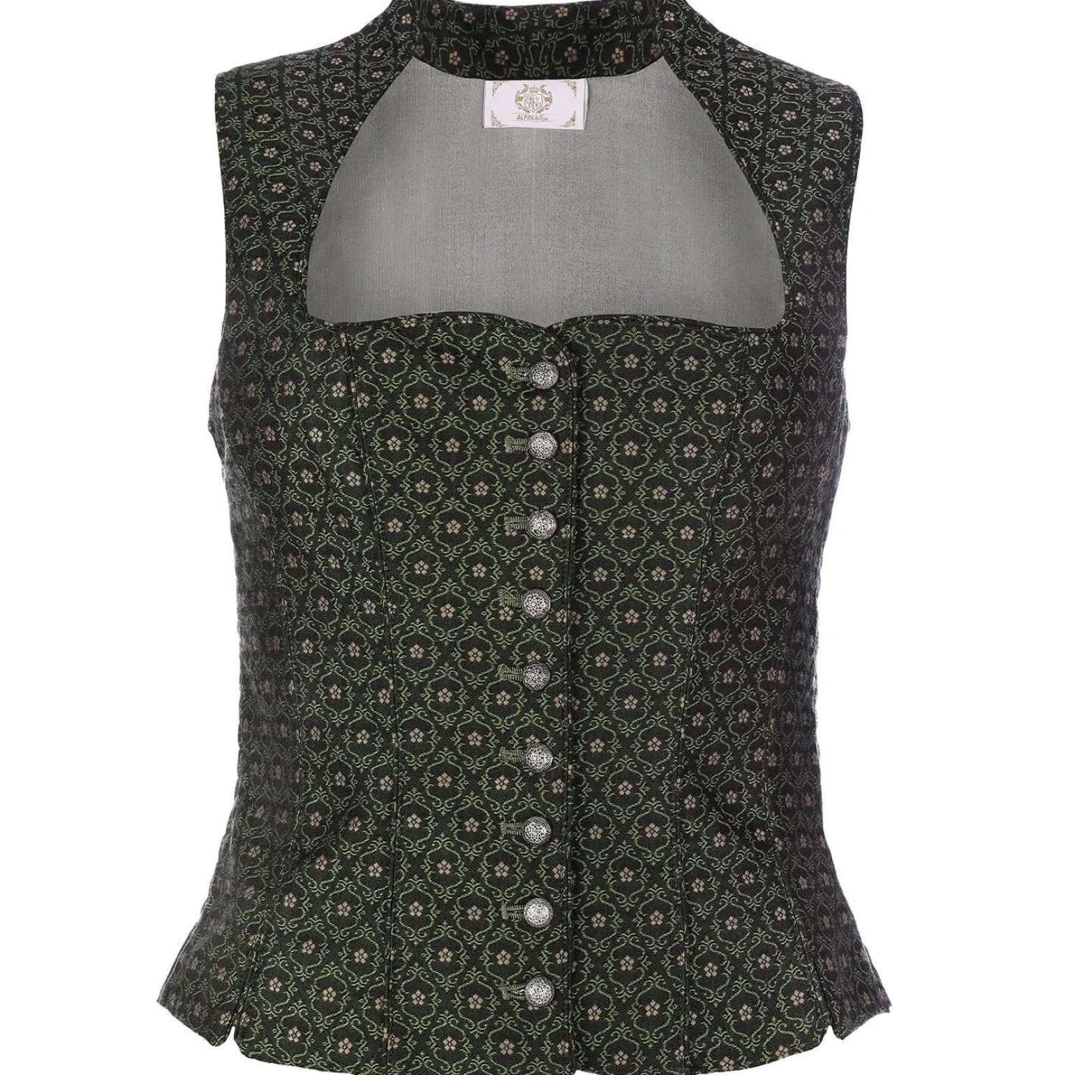 Das Dirndl-Mieder „Arina“ in Moosgrün kombiniert traditionellen Charme mit modernem Komfort. Das dehnbare Material bietet perfekte Passform und Bewegungsfreiheit. Mit edlem Muster und stilvollen Knöpfen vereint es Tradition und zeitgemäße Eleganz.