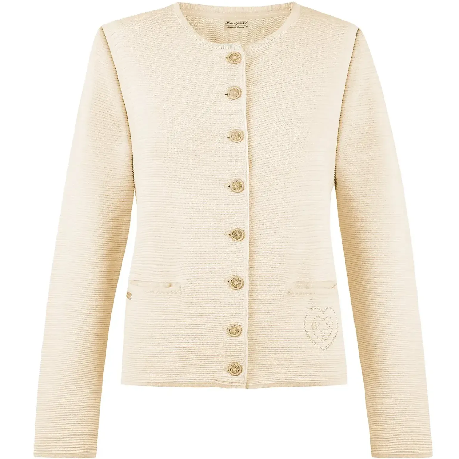 Die kleinen funkelnden Glitzersteine, die in kunstvoller Anordnung ein Herz formen, verleihen der Strickjacke eine verspielte Note und setzen einen glamourösen Akzent.Die Knöpfe der Strickjacke sind mit einer Blume verziert, was dem Kleidungsstück einen Hauch von Alpencharme verleiht. Diese kleinen, aber feinen Details machen die Knöpfe zu einem hübschen Blickfang und fügen einen subtilen Hauch von Eleganz hinzu.