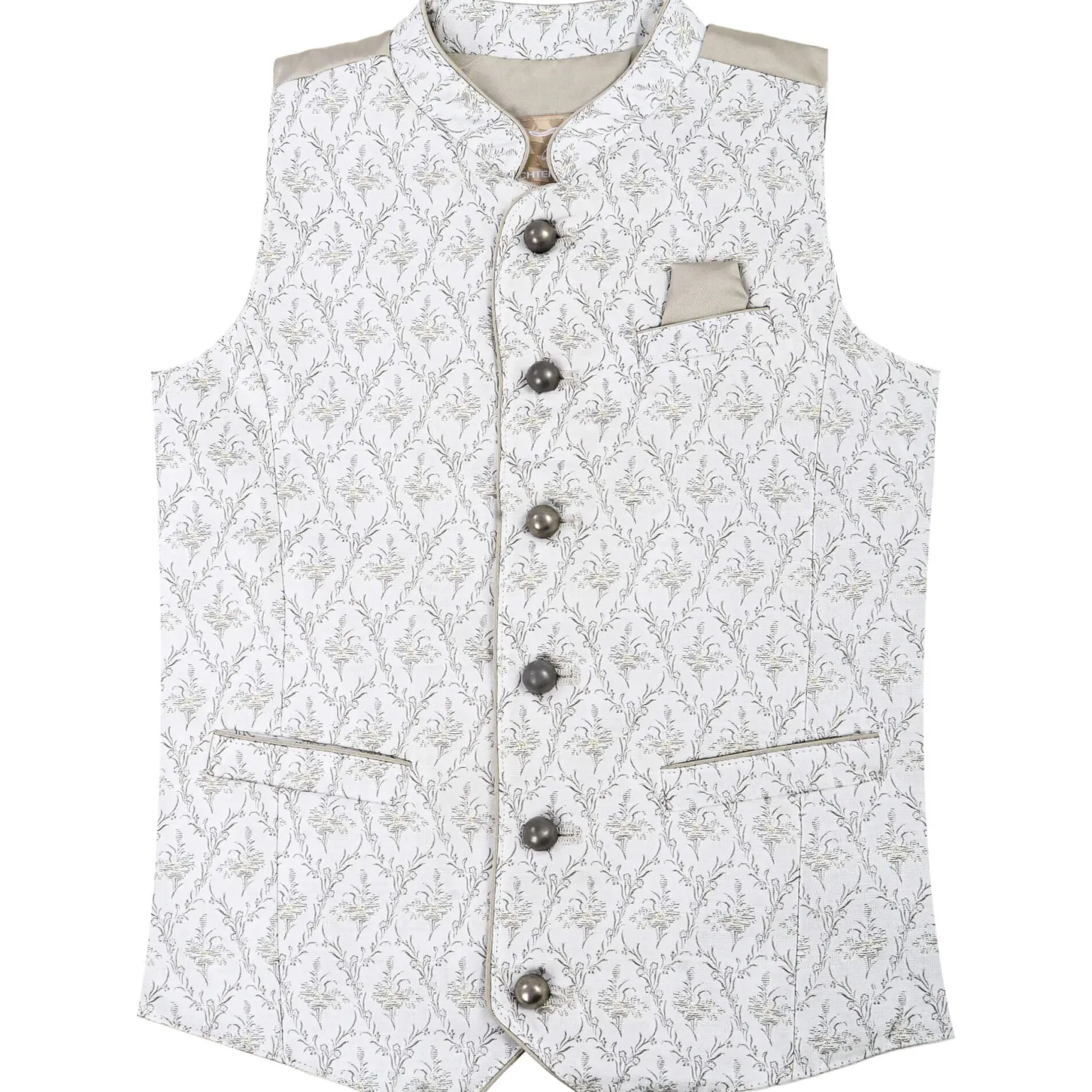 Dieses bezaubernde Kinder-Gilet in einem eleganten Creme-Ton ist aus hochwertigem Jacquard-Stoff gefertigt, der eine ansprechende Seidenoptik bietet.Die gerade Schnittführung sorgt für eine bequeme Passform, während der klassische Stehkragen dem Gilet einen stilvollen Akzent verleiht. Praktische Taschen und eine ansprechende Knopfleiste runden das Design ab und machen es zu einem idealen Kleidungsstück für besondere Anlässe oder den Alltag.Ein perfektes Accessoire, das sowohl modisch als auch funktional ist!