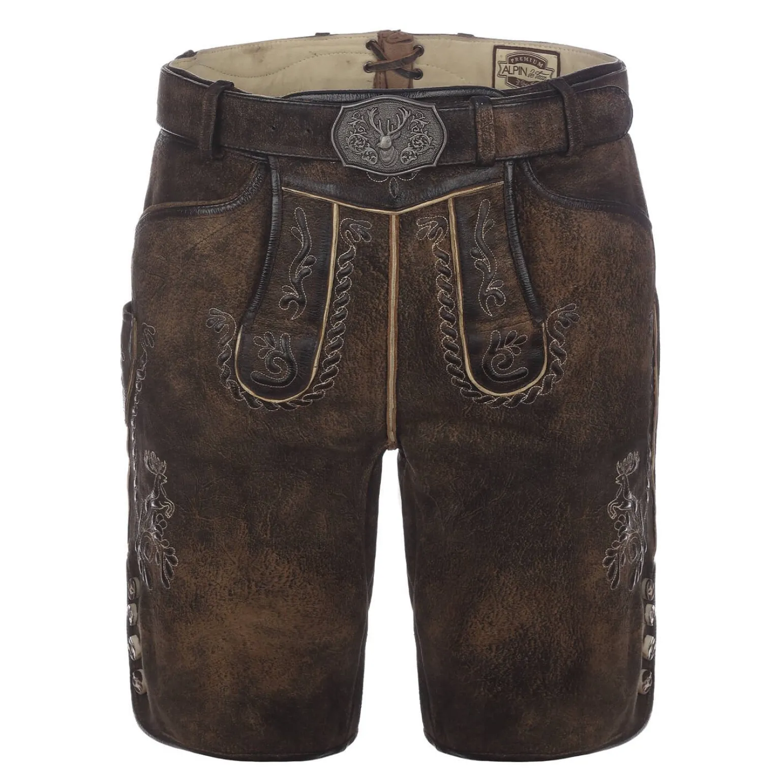 Aus feinstem Ziegenleder bietet die Herren Lederhose in Dunkelbraun ein weiches Tragegefühl und einem verstellbarem Bund hinten. Verziert wird sie mit Hirschhornknöpfe, einer Metallschnalle mit Hirschkopfmotiv und Stickereien.