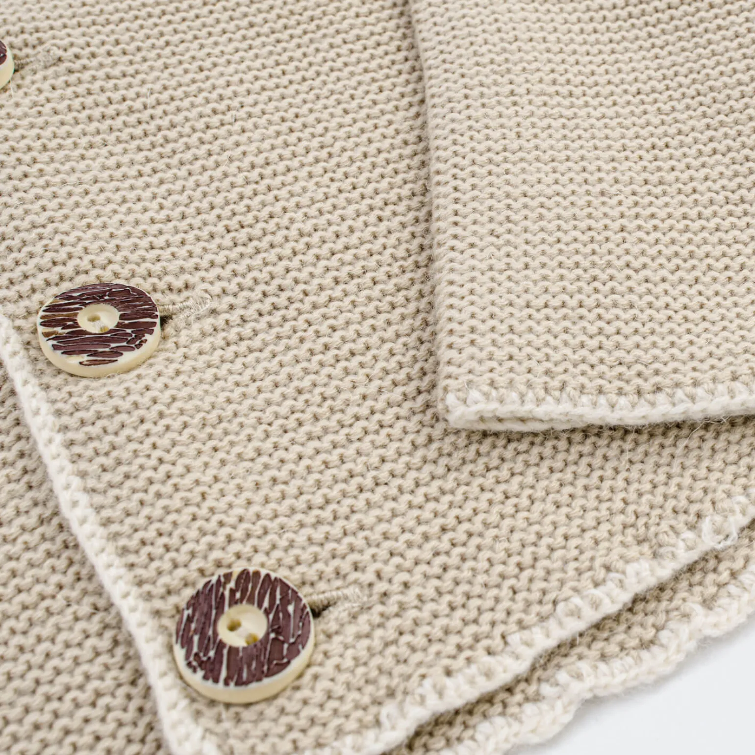 Klassische Kinder-Strickjacke, die sowohl für Jungen als auch Mädchen geeignet ist. Die Jacke ist in einem eleganten Beige gehalten und mit Knöpfen in Hirschhornoptik versehen.Die Strickjacke besteht aus einer Mischung aus 50% Acryl und 50% Wolle, was für eine angenehme Wärme und Tragekomfort sorgt.Der niedrige Stehkragen verleiht der Jacke eine schlichte Eleganz. Die Knopfverschlüsse in Hirschhornoptik setzen traditionelle Akzente. Das Muster präsentiert sich in unifarbenem Beige mit einem karierten Innenkragen. Ein weißer Häkel-Rand entlang des Abschlusses und der Verschlüsse verleiht der Strickjacke einen charmanten, verspielten Touch.Diese vielseitige Kinder-Strickjacke passt sowohl zur Lederhose als auch zum Dirndl.