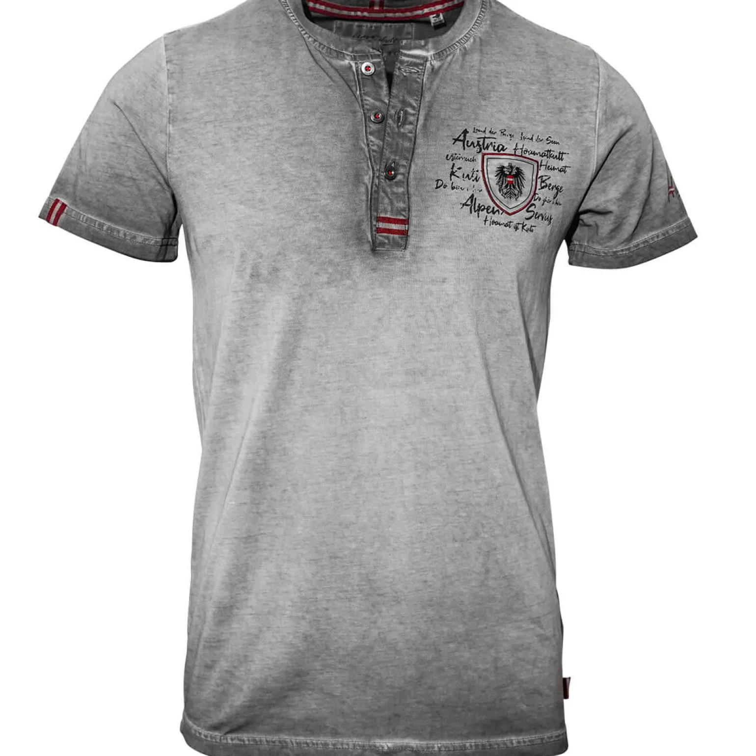 Graues Herren T-Shirt „Adler Wappen Vintage“ aus Baumwolle. Bietet angenehmen Tragekomfort, Kurzarm, Logo-Details an Ärmelenden und Kragen. Verziert mit Adler-Wappen, Schrift und Knopfleiste auf der Brust. Das Highlight ist der große Adler-Druck auf der Rückseite.