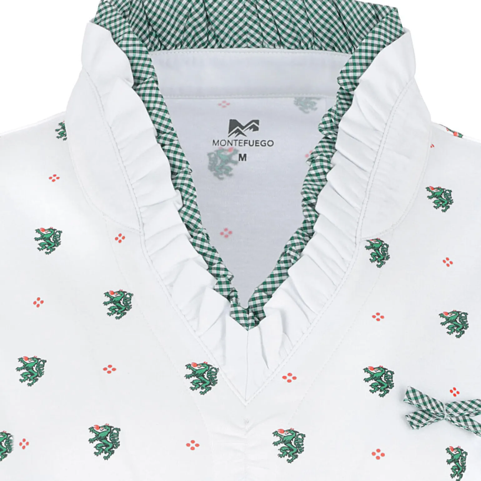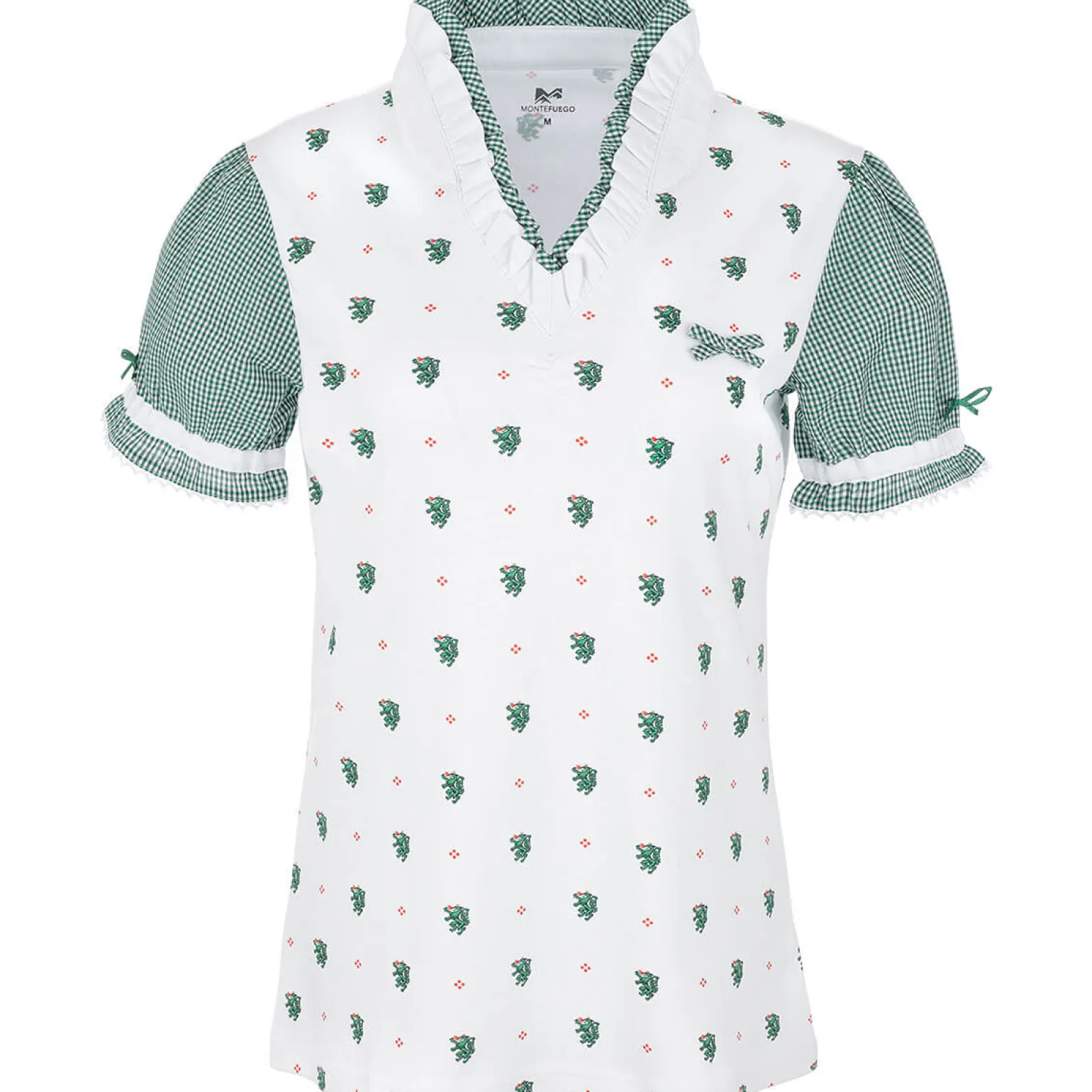 Das Damen Rüschen-Shirt „Steiermark“ ist stilvoll und bequem. Es ist weiß mit grünen Akzenten und aus Baumwolle. Der V-Ausschnitt hat hübsche Rüschen, die es besonders machen. Die Puffärmelchen sind mit einem grünen Karomuster und jeweils einer Maschen verziert, die dem Shirt einen charmanten Stil verleihen. Auf der Brust gibt es eine karierte Masche. Kleine Steiermark-Wappen-Drachen sind auf dem ganzen Shirt verteilt, was es einzigartig macht. Das Shirt ist perfekt für festliche Anlässe, Trachtenevents oder einfach für jeden Tag. Es zeigt deine Liebe zur Steiermark und ist ein Muss für alle, die Tradition und Stil mögen.