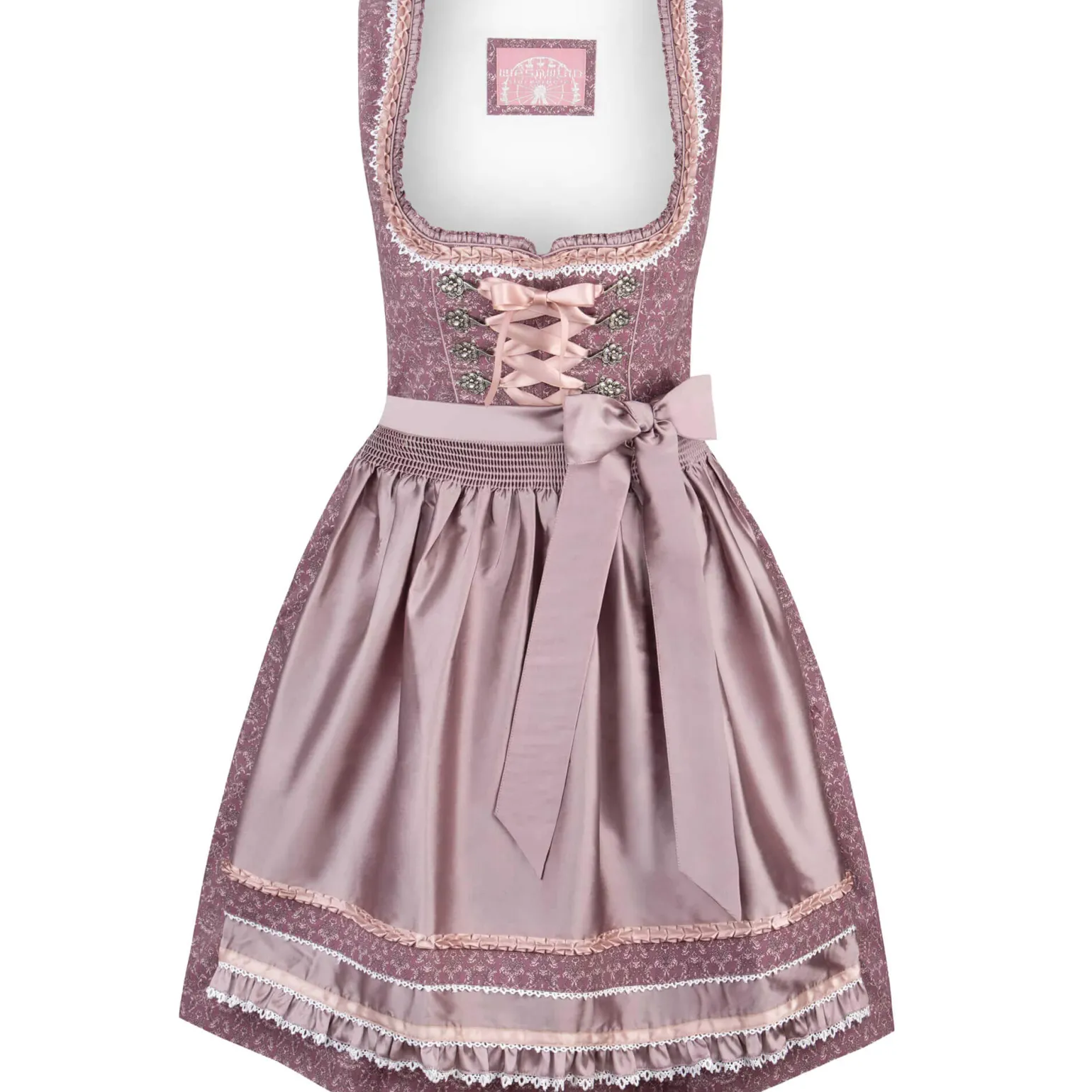Das hübsche Dirndl mit Blumenmuster und ist mit liebevollen Details geschmückt. Rüschen am Ausschnitt, Zierborten und funkelnde Haken mit Strasssteinen machen das Damen Dirndl besonders. Die Schnürung mit einem passenden Satinband ist gut durchdacht. Der Dirndl Rock hat eine praktische Tasche und fällt sehr schön. Die farblich passende Schürze mit dekorativen Bändern ergänzt das trachtige Outfit perfekt.