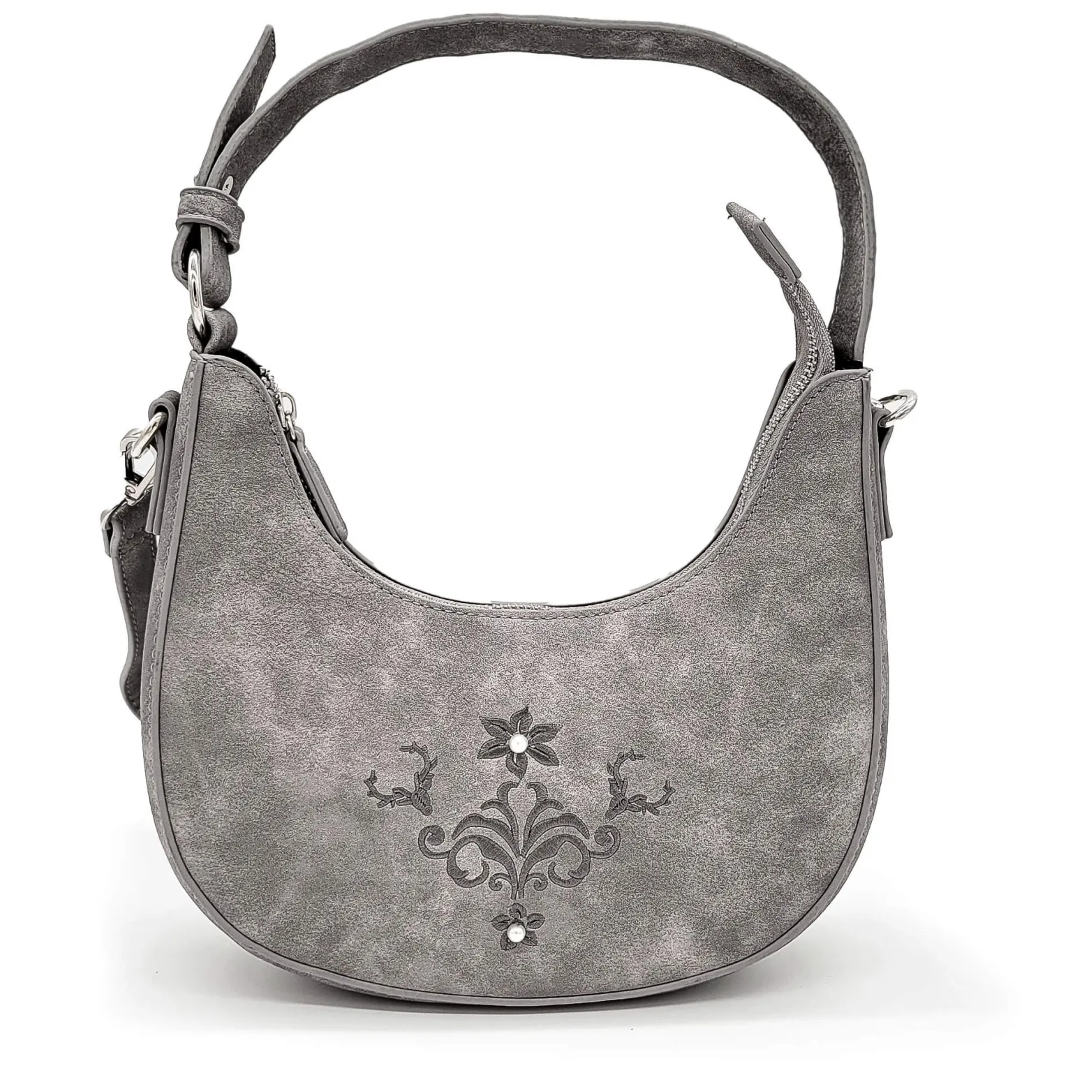 Die Damen-Handtasche „Chica“ aus hochwertigem grauem Velourkunstleder verbindet elegantes Design mit funktionaler Vielseitigkeit. Ihre geschwungene Halbmondform sorgt für eine stilvolle Optik, während die kunstvolle Stickerei auf der Vorderseite, verziert mit zwei weißen Perlen, einen Hauch von Exklusivität verleiht.Dank des praktischen Henkels und des abnehmbaren Tragegurts kann die „Chica“ entweder lässig über der Schulter oder klassisch in der Hand getragen werden. Der robuste Reißverschluss bietet zuverlässigen Schutz für den Inhalt und ergänzt das durchdachte Design. Ob für den Alltag oder besondere Anlässe – diese Tasche ist ein stilvoller Begleiter für Frauen, die auf Details und Funktionalität gleichermaßen Wert legen.