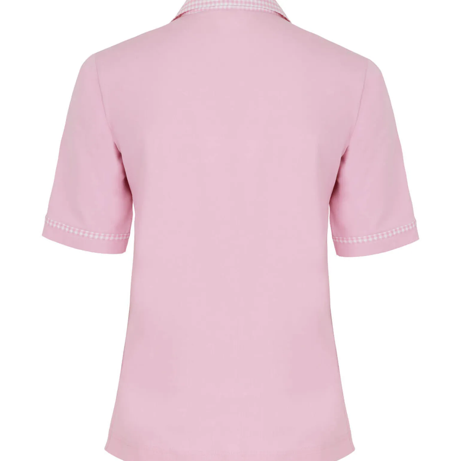 In verschiedenen Farben erhältlich, sorgt das Damen-Polo für einen abwechslungsreichen Look. Das Polo besteht aus Baumwolle und hat eine dezente Blumenstickerei in Weiß vorne am Kragen. Der Kragen ist kariert und an den Seiten gibt es zwei Schlitze.