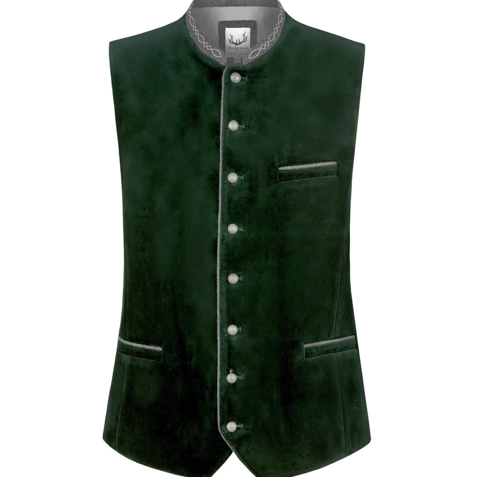 Die klassische Baumwollsamt-Weste ist der Trachten-Klassiker.Der Stehkragen aus besticktem Lodenstoff verleiht einen einzigartigen Stil. Passende Paspel betonen das traditionelle Design. Der gerade Schnitt sorgt für perfekte Passform und hohen Tragekomfort.Der Rücken aus schwarz gestreiftem Jacquardstoff ist verstellbar. Altsilberne Kugelknöpfe verleihen ein edles Finish. Perfekt kombinierbar mit unseren traditionellen Trachtenhemden und Lederhosen.Ein neues Stück Heimat in zeitlosem Look.